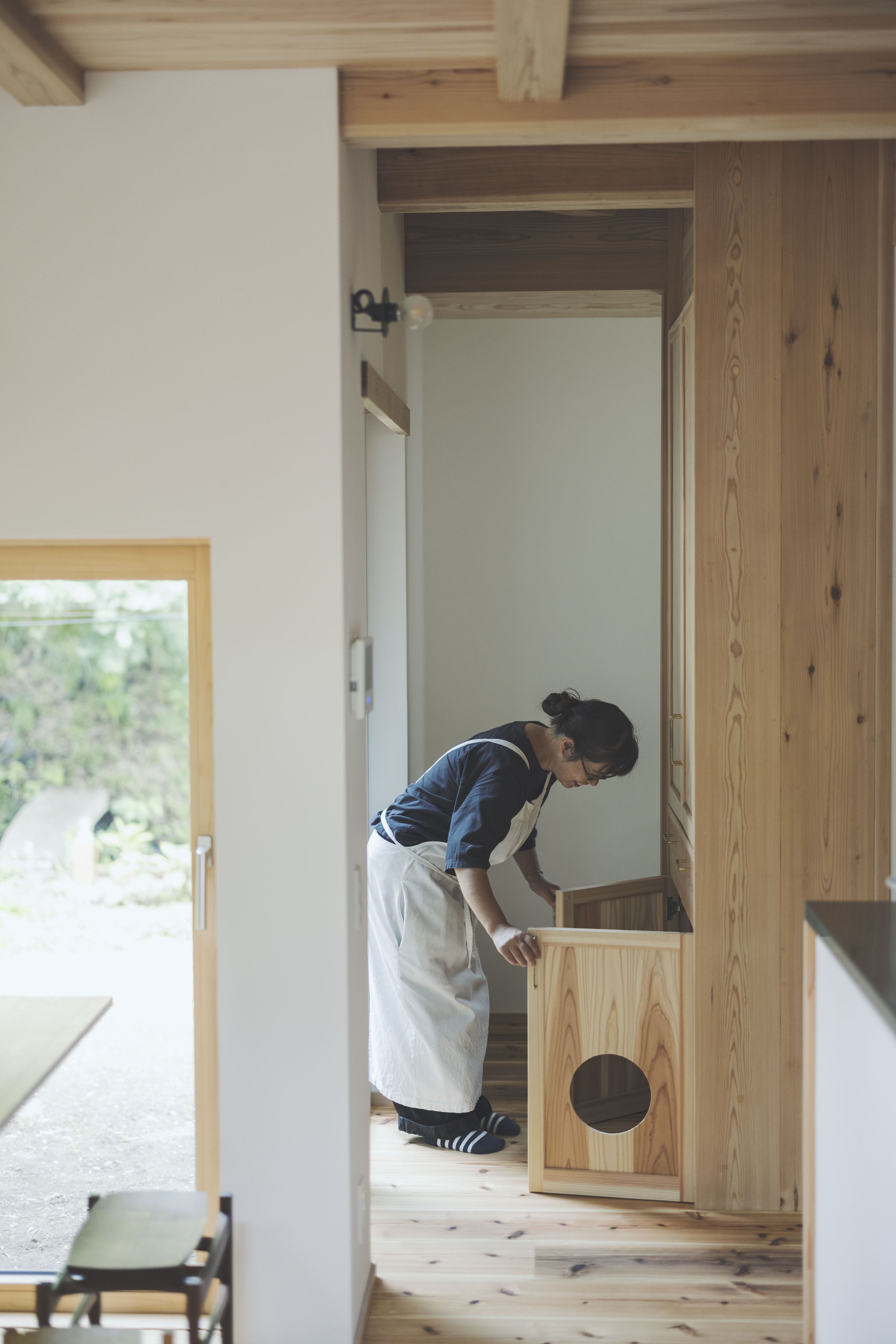 偶然なのですが、私にご依頼いただく施主の方はペットを飼っていらっしゃる方が多いです。私自身はペットと暮らしてはいないのですが人と猫、犬などが快適に暮らすためには小さな工夫が大きな差をもたらすと考え、施主の方と一緒に必ずペット関連の場所や収納についても考えます。今回の工夫はペットのトイレをむき出しにせず、ペット自身も落ち着いて用を足せるスペースを創るという設計です。日頃、家族の中では見慣れていて気にならなくても、来客時には気をつかったり、猫自身も落ち着かないという経験をされた方もいると思います。そこでペットのトイレを収納の中に隠して、ペット自身は扉の丸くくり抜かれた部分から出入り自由、上部にはフードやペット関連の物を入れられるというかたちを考えました。この収納自体を設置する場所も、処理のしやすさを考慮して、施主の方と一緒に生活の仕方を話しながら決めていきます。このように家を建てる時に「後から何とかなるかな」、と思われがちな部分を大切にすることが、人とペットの快適な暮らしにつながっていくと思います。