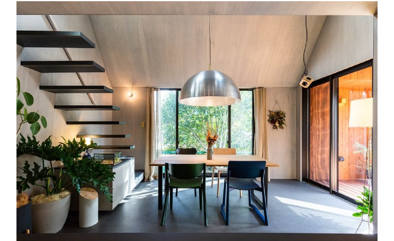 外観は黒い屋根と木の軒裏が対比する端正なフォルムで、内部はグレーの壁にブラックのキッチンと明るい木を組み合わせ、落ち着きの中に温もりが漂います。
