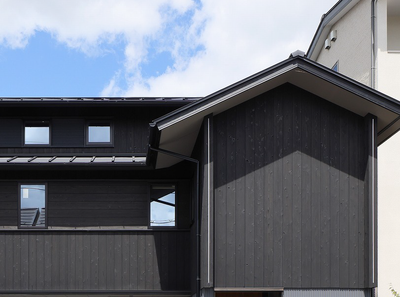 立地する伏見は美観地区に指定され、屋根勾配や軒の出などにも厳しい制約があります。歴史ある酒蔵が並ぶ街並みに呼応し、外壁には黒の焼杉を採用。