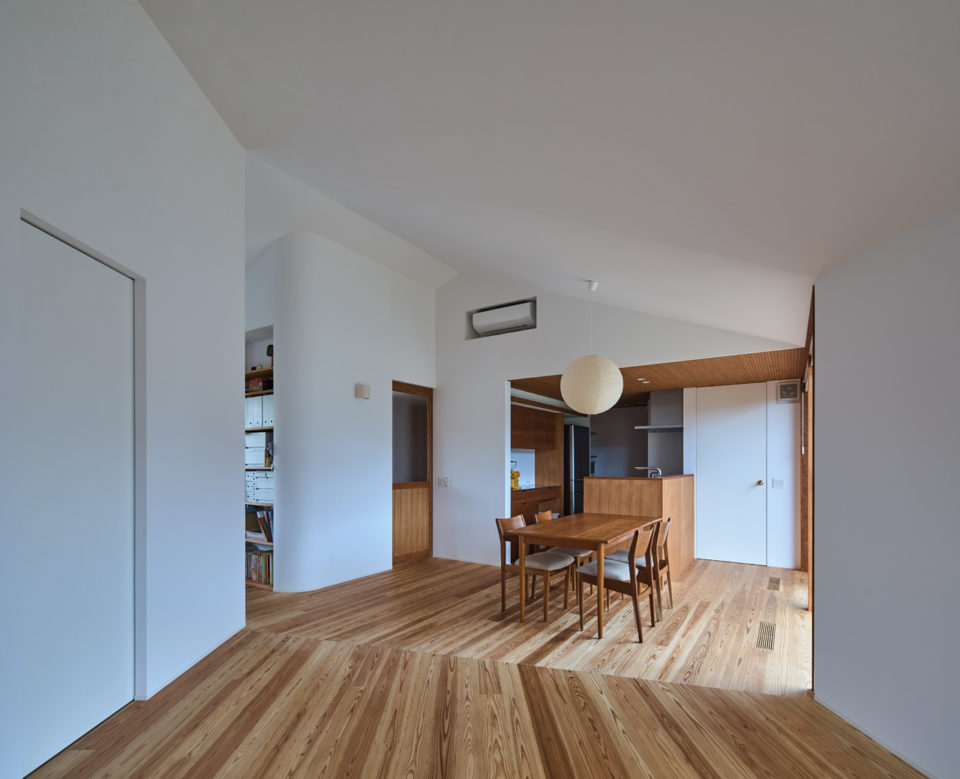 お施主様が幼い頃から慣れ親しんできた敷地。ご希望の収納スペースの確保とスムーズな動線計画を満たしながら、この場所ならではの景色をどのように住まいに取り入れるかを軸に考えた結果、「くの字」のような形状の住まいとなりました。