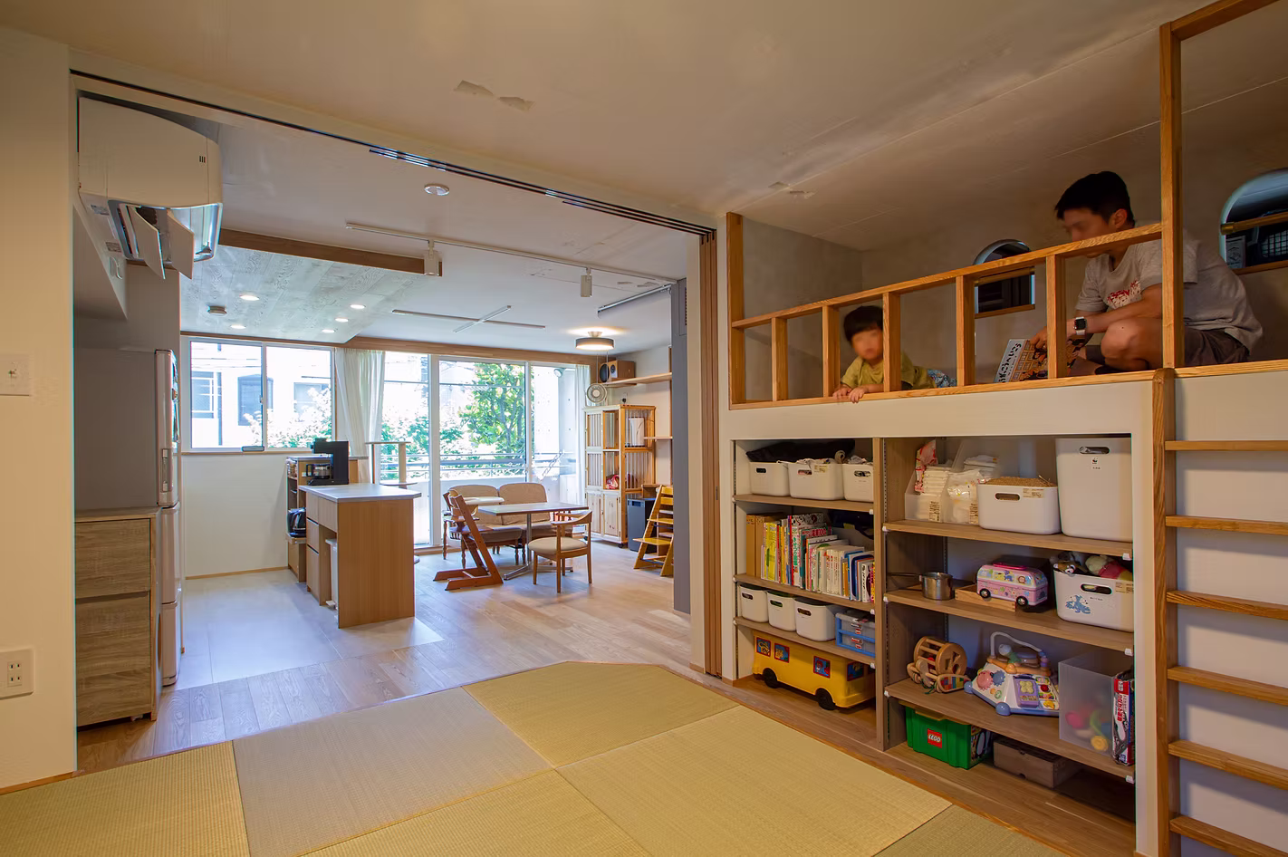 上段に設けたベッドから畳の小上がりへ飛び降りるなど、子どもたちの遊び方を想定したデザインで、家そのものが遊び場になる…そんな住まいです。