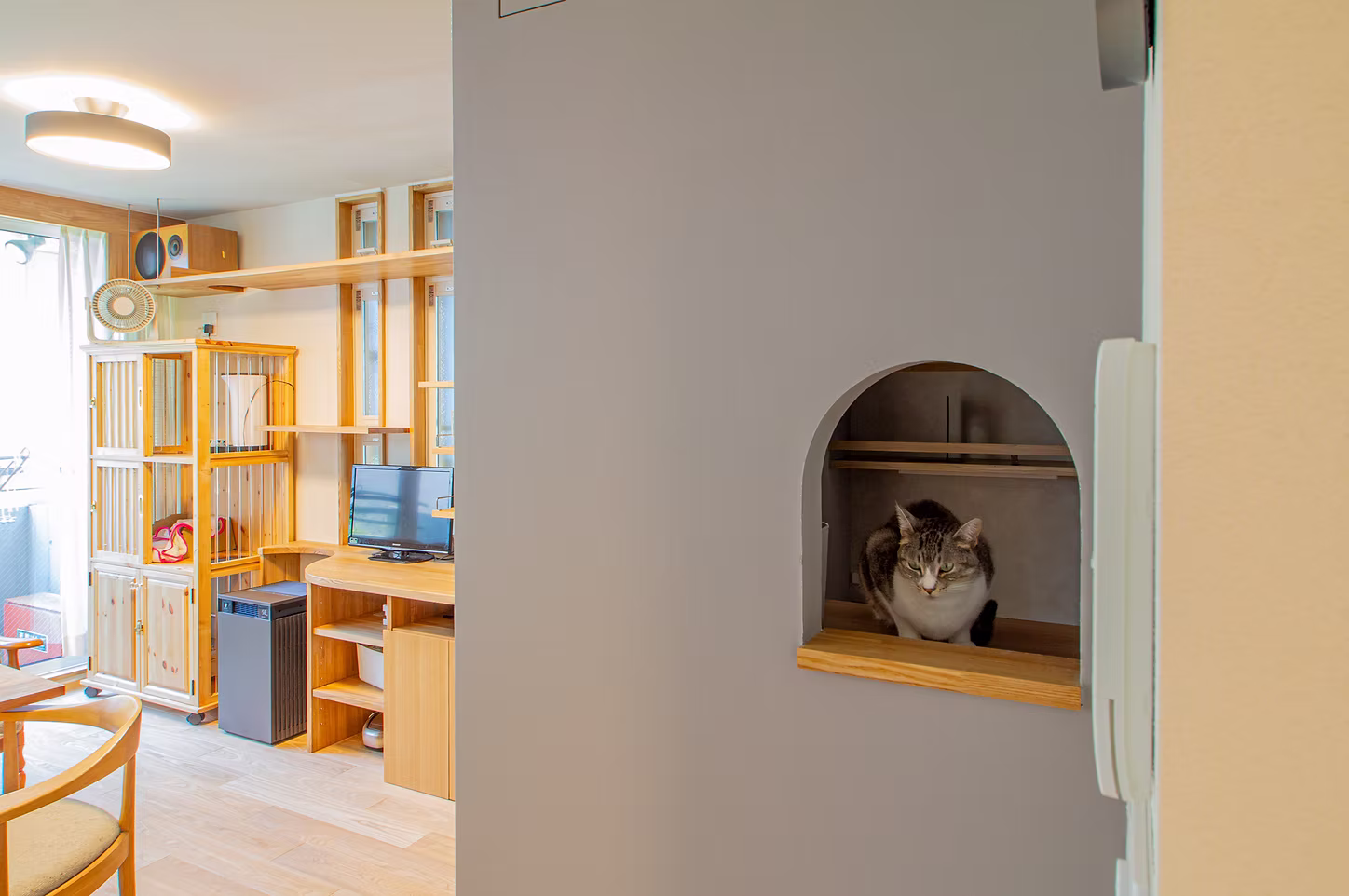 マンションでありながら、まるで遊具の中で暮らしているかのように、子どもも猫ものびのびと楽しめる住まいが実現しました。