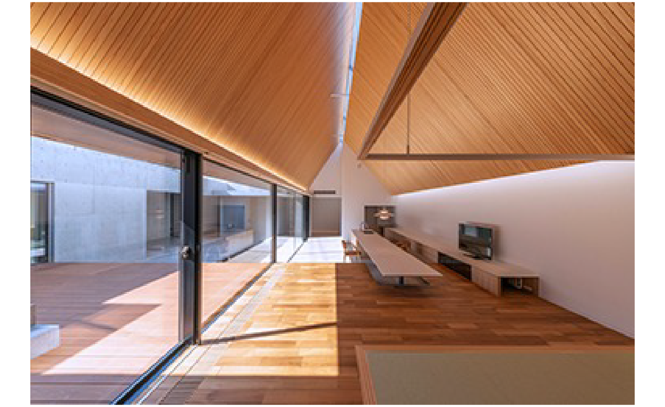 日々の動作が自然にほどけ、外が暮らしの延長へと静かにひらけていく。 街からそっと囲いながら、内に入れば光と高さと素材がゆるやかに繋がる住まいです。