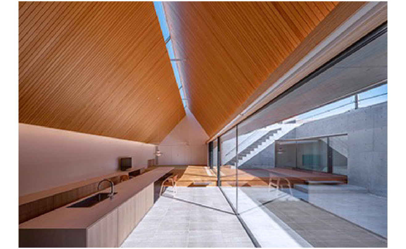 大きな特徴は、八ヶ岳の稜線を最も美しく切り取るために考え抜かれた開口の計画。視線の抜ける上部に窓を配置し、キッチンや玄関の奥からでも山の気配が感じられるようにしているのです。