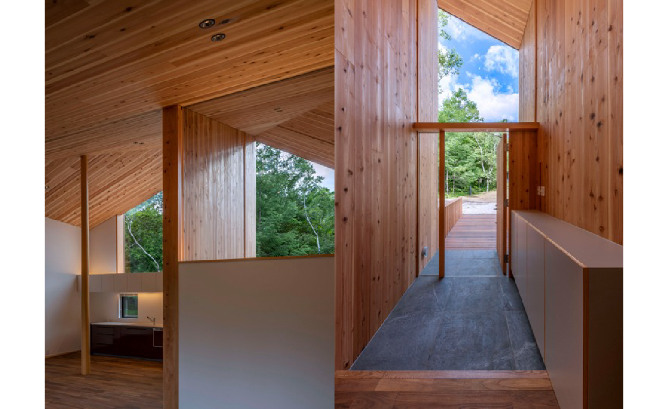 まず前面道路との高低差を解消するため、玄関へはブリッジでアプローチ。雨が流れ、雪が積もっても管理しやすい高床構造とし、基礎はコンクリートでしっかり固めた上にデッキだけを森へ張り出す構成としています。