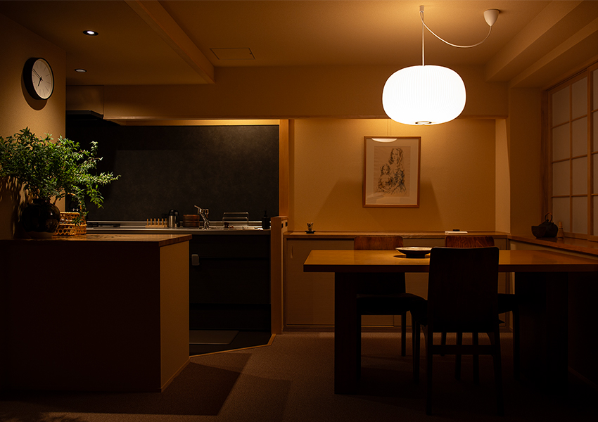 仕上げはタモ材と一色のクロスに絞り、素材や色味を最小限に統一。床に採用した絨毯は光を吸収し、足元の質感を柔らげることで和の要素を過度に強調せず、穏やかで深みのある雰囲気をもたらします。夜は照明を落とすと、小料理屋のような雰囲気です。