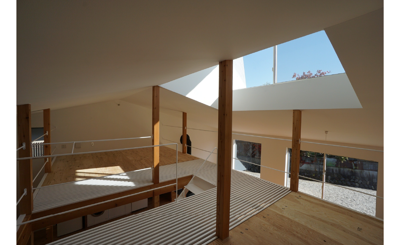 平面は短手四間・長手六間の矩形とし、長手方向に水勾配をとる切妻屋根を架けています。屋根の中央部のみを高く持ち上げ、その内部に2階を内包することで、建物全体の高さを抑えながらも立体的な空間を生み出しています。