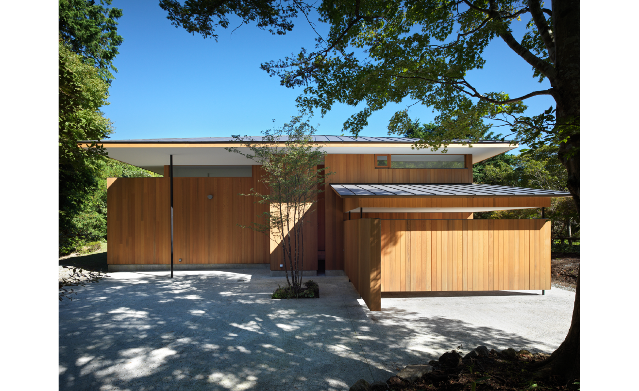 外観は深い軒と木質の外壁で構成され、昼と夜で表情を変えます。夜には室内の光が柔らかく漏れ、庭と建物の輪郭が静かに浮かび上がります。内部では、視線の先に常に庭や木立が入り込み、屋内外の境界を意識させません。