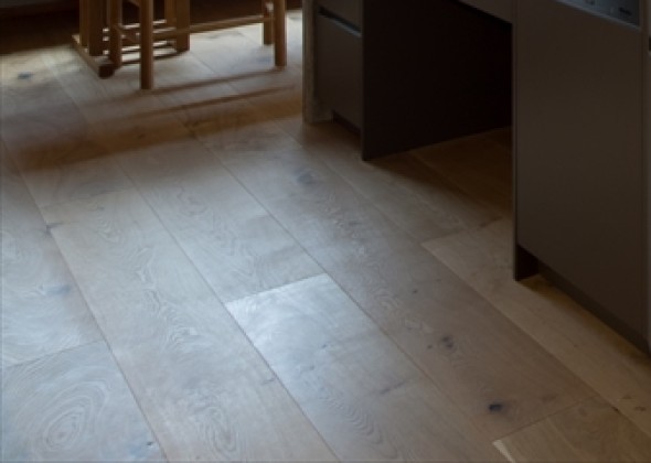 当初は既製品のV型キッチンをご希望されていましたが、住まいの形状に対してもっとゆるやかな角度にすると家族の動線にピタリと合致しため、造作キッチンとしました。デザイン性だけでなく調理の可動域が広がり、子どもの様子も見守りやすくなったと喜ばれています。さらに空間に広がりを感じさせる視覚効果も生み出しています。