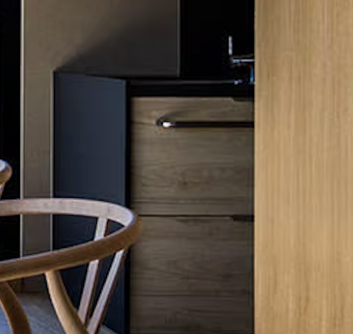 子世帯のリビング・ダイニング・キッチンは、眺望をより積極的に取り込む空間として計画しています。キッチン正面にはミラー仕上げを施し、窓の外に広がる景色を室内に映し込むことで、空間に奥行きと広がりを与えます。レンジフードを隠したすっきりとしたキッチンとし、家族3人の暮らしに合わせて、水廻りを含む生活動線は使いやすさを重視しています。