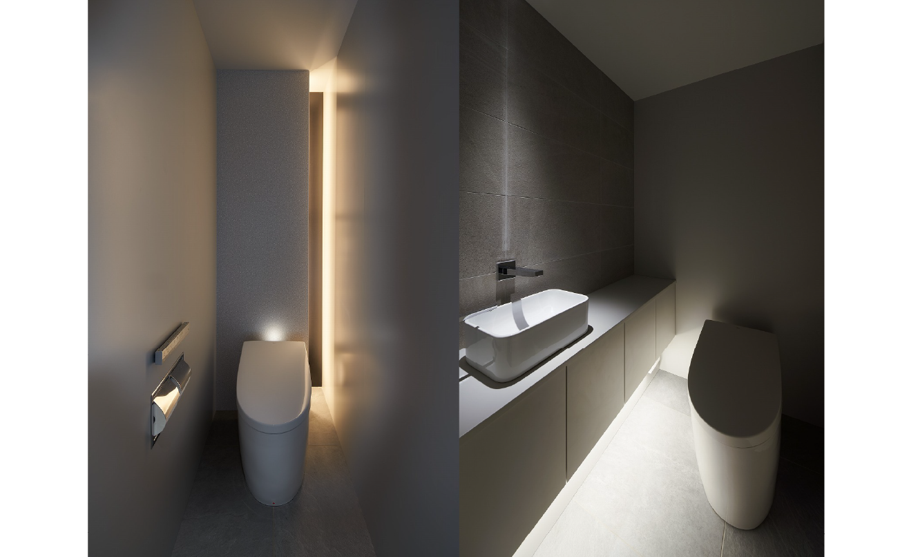 洗面でも、使う場面でだけ点けたいという要望に対し、器具を見せない位置に間接照明を仕込み、必要な明るさだけを確保しています。光を“足す”というより、視界を乱さずに“整える”設計です。