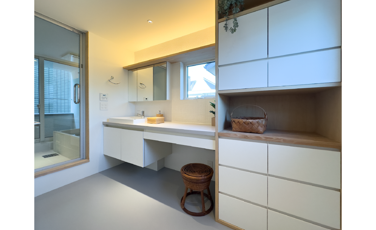 洗面まわりは既製品をベースにしつつ、収納やカウンターの納まりを工夫することで、造作のような一体感を実現しました。