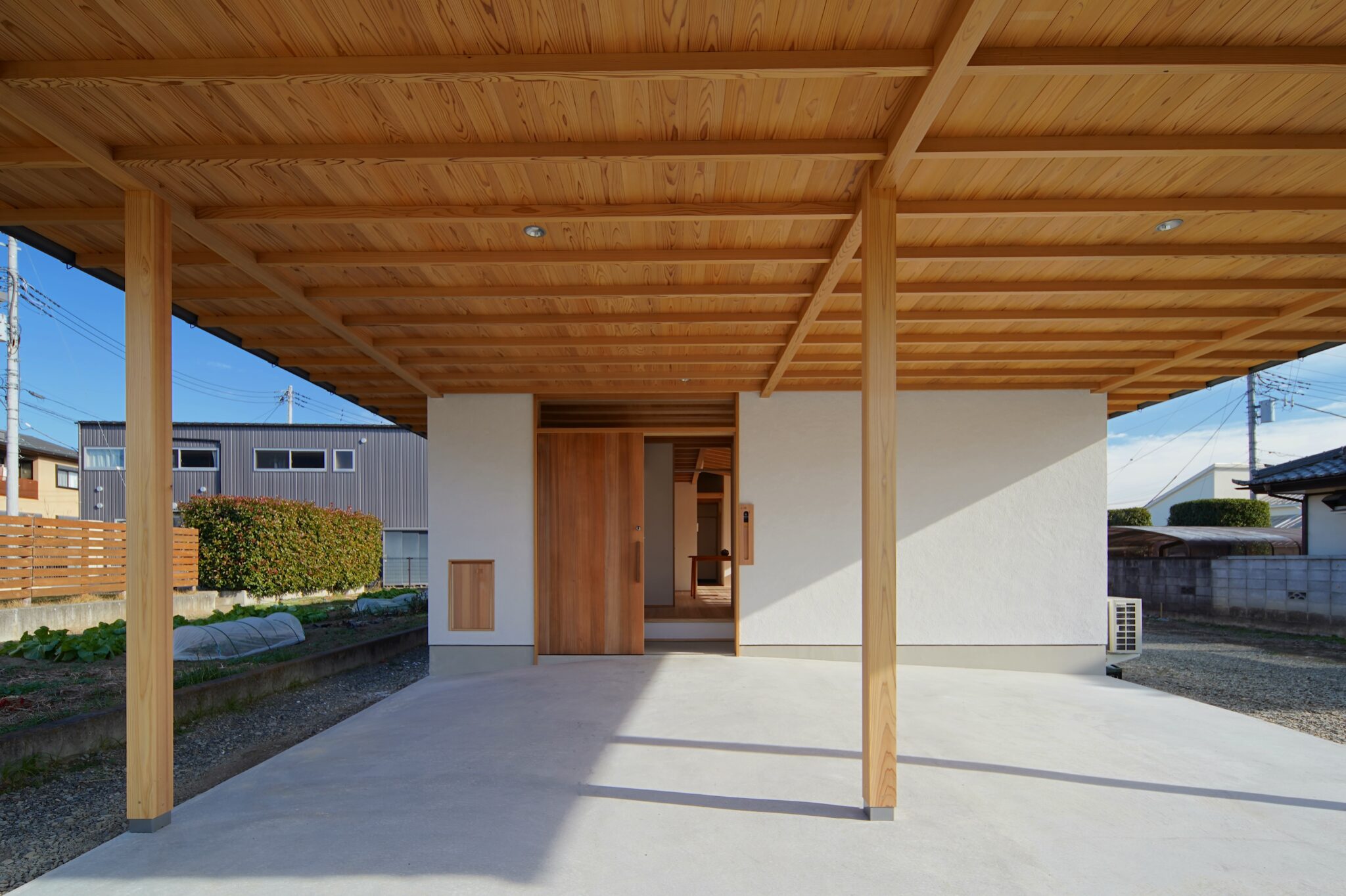 ごちゃごちゃとしないスッキリとした平面。開放的でおおらかな空間や開口部。軒先は薄くかつ、どこまでも連続してゆくようなデザイン。そして杉材の美しさと陰影が生まれるような天井。