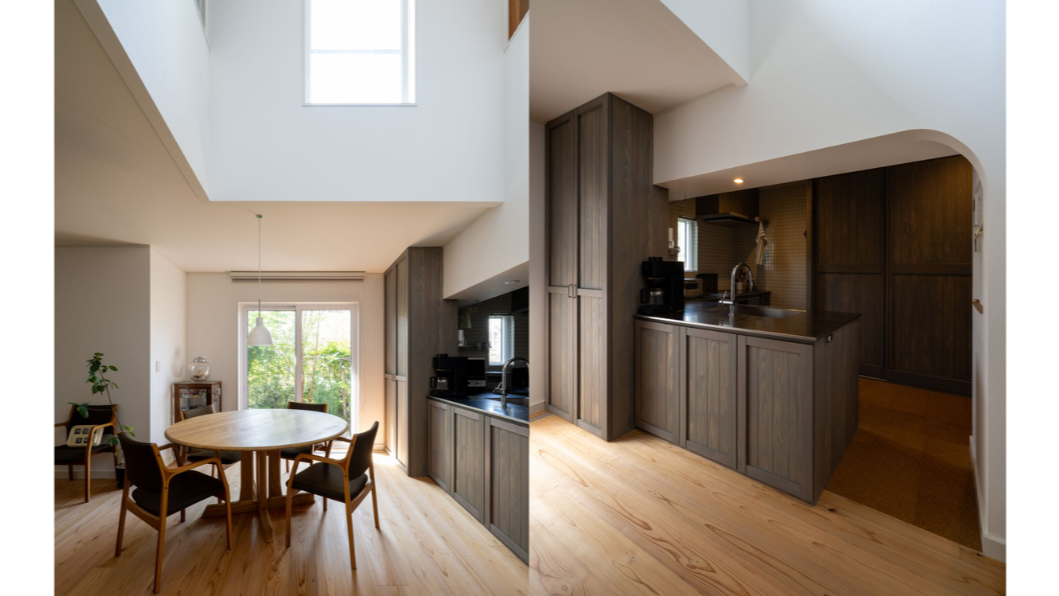 終の住処ということもあり、光の入り方や空間の明暗のバランスに配慮。吹き抜けに面したダイニングは、明るい光が差し込む開放的な場所に。そのすぐ隣のリビングは、あえて天井を低く抑えることで、落ち着いた空間としています。