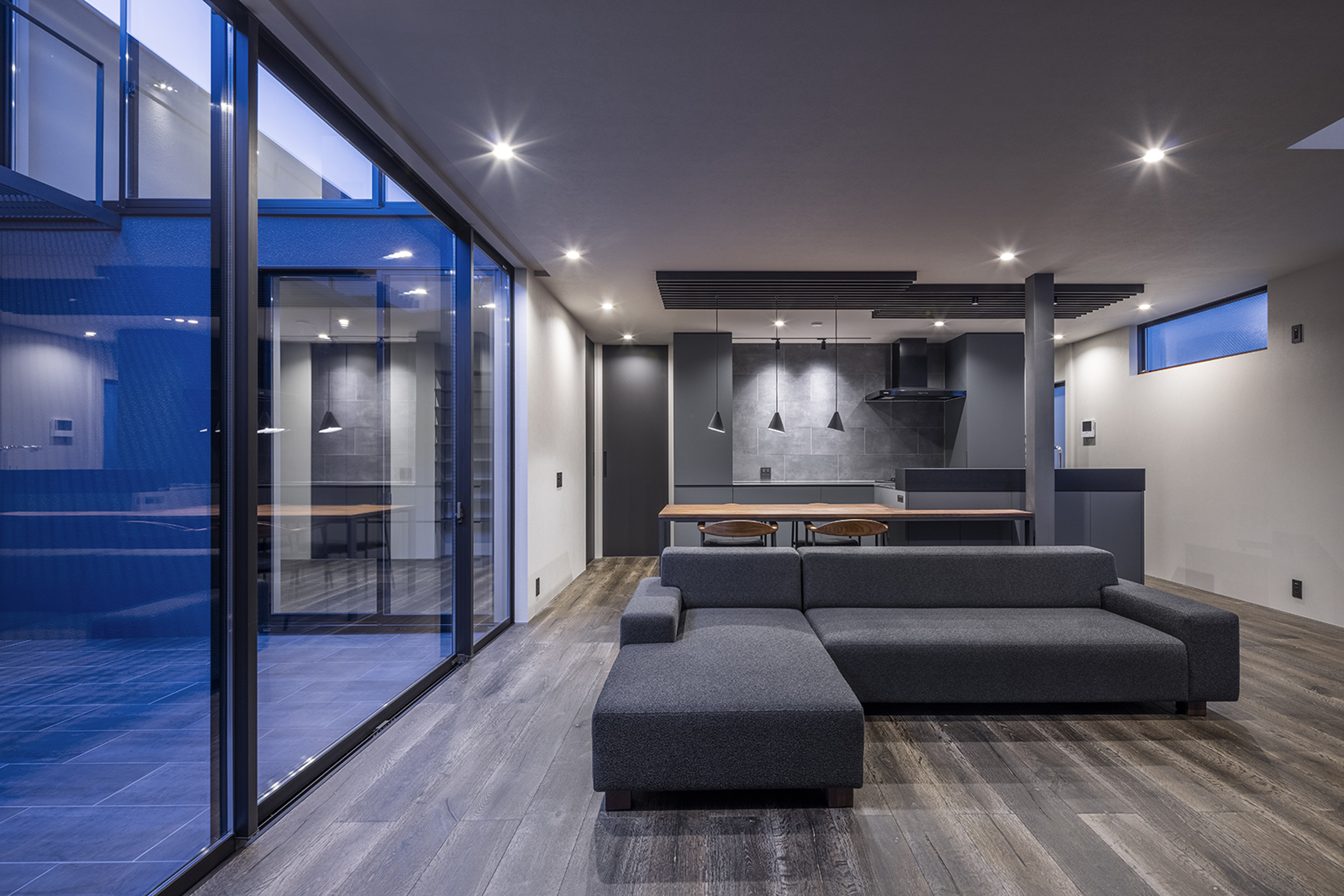 住宅密集地では、どうしてもカーテンを閉め切った生活になりがちです。そこで住まいの中心に中庭を置き、中庭に向けて窓を設けることで、外部からの視線を気にせず光や風を取り込む構成としました。