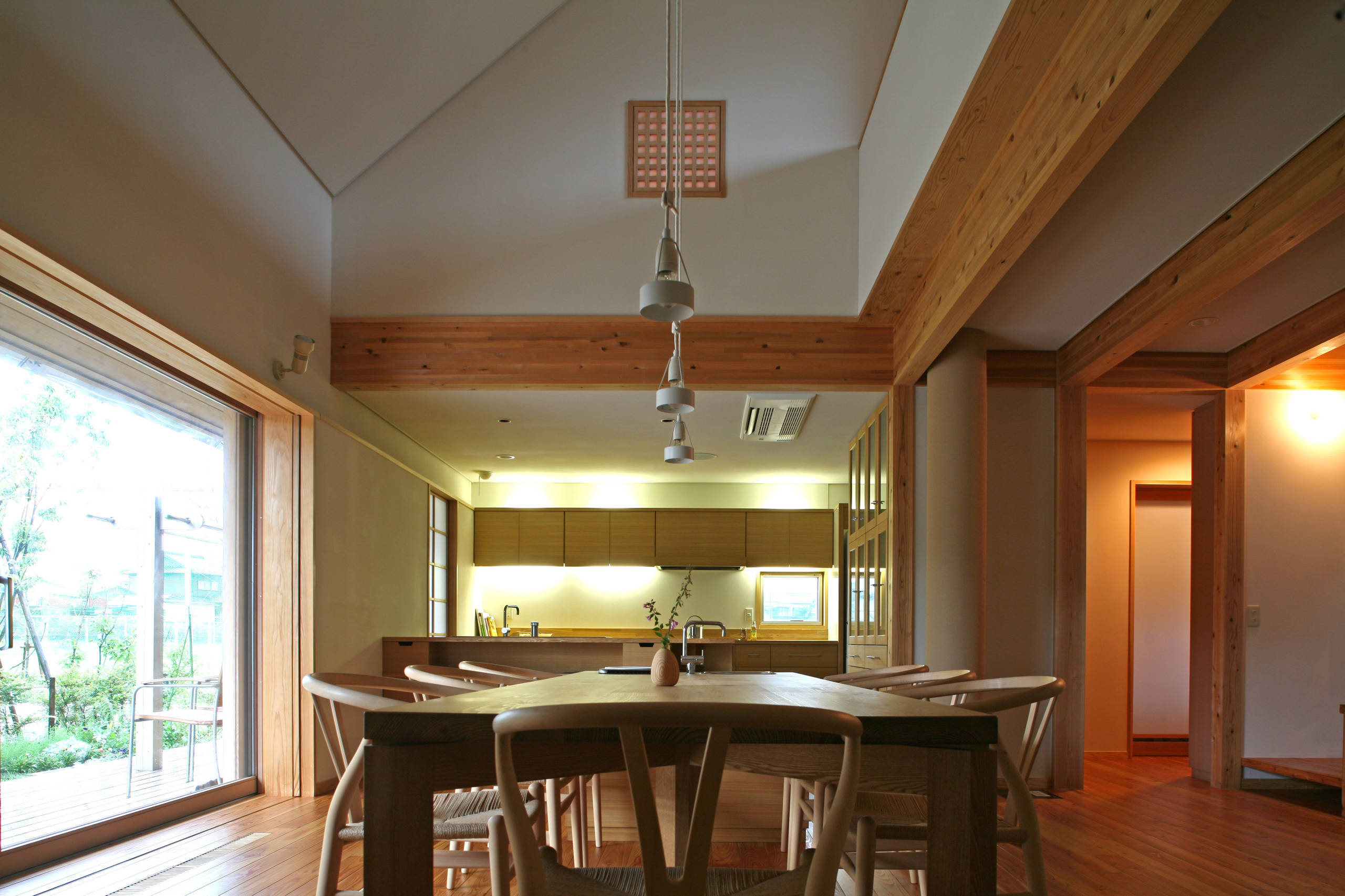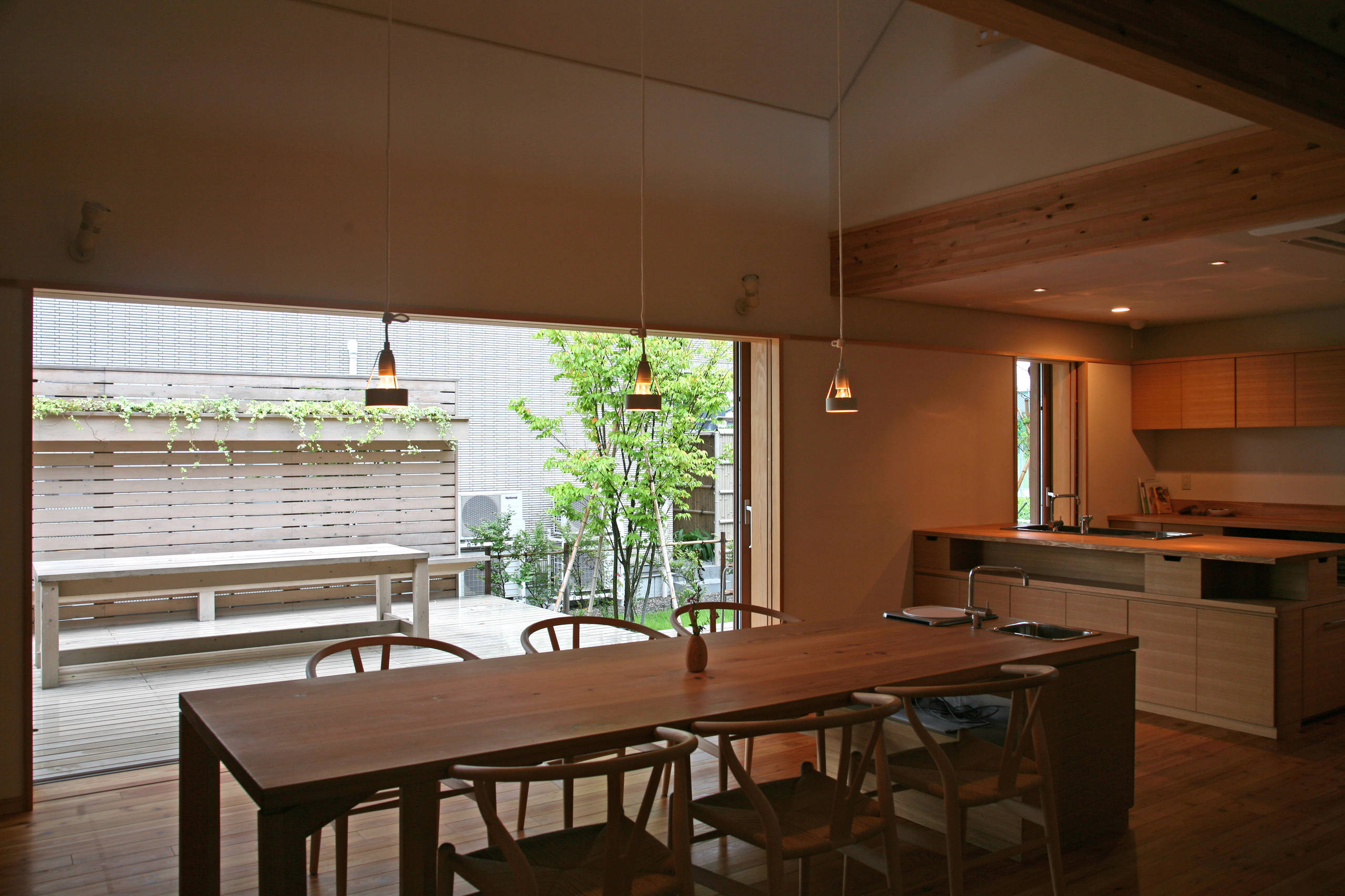 家の中心は全開口できる木製サッシと大きなテーブルと吹抜のあるダイニング。