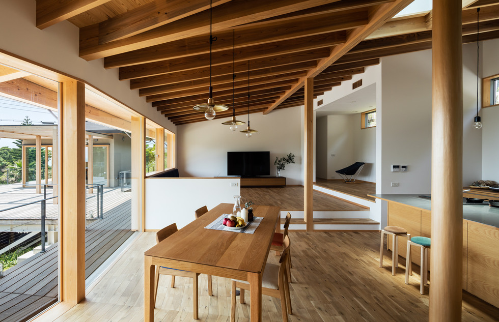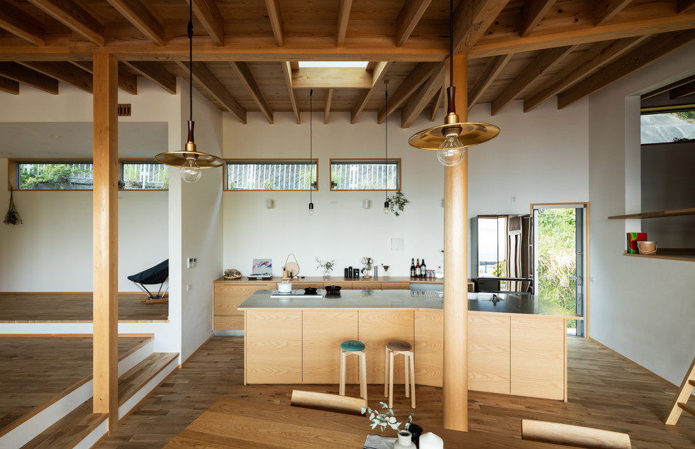 『白浜町の家』は目の前に海が広がる素晴らしい眺望の敷地です。そこでLDKの設計をする際に、室内からもこの景色を視界を遮るものなく眺められ、天井面も汚くしない方法を考えました。