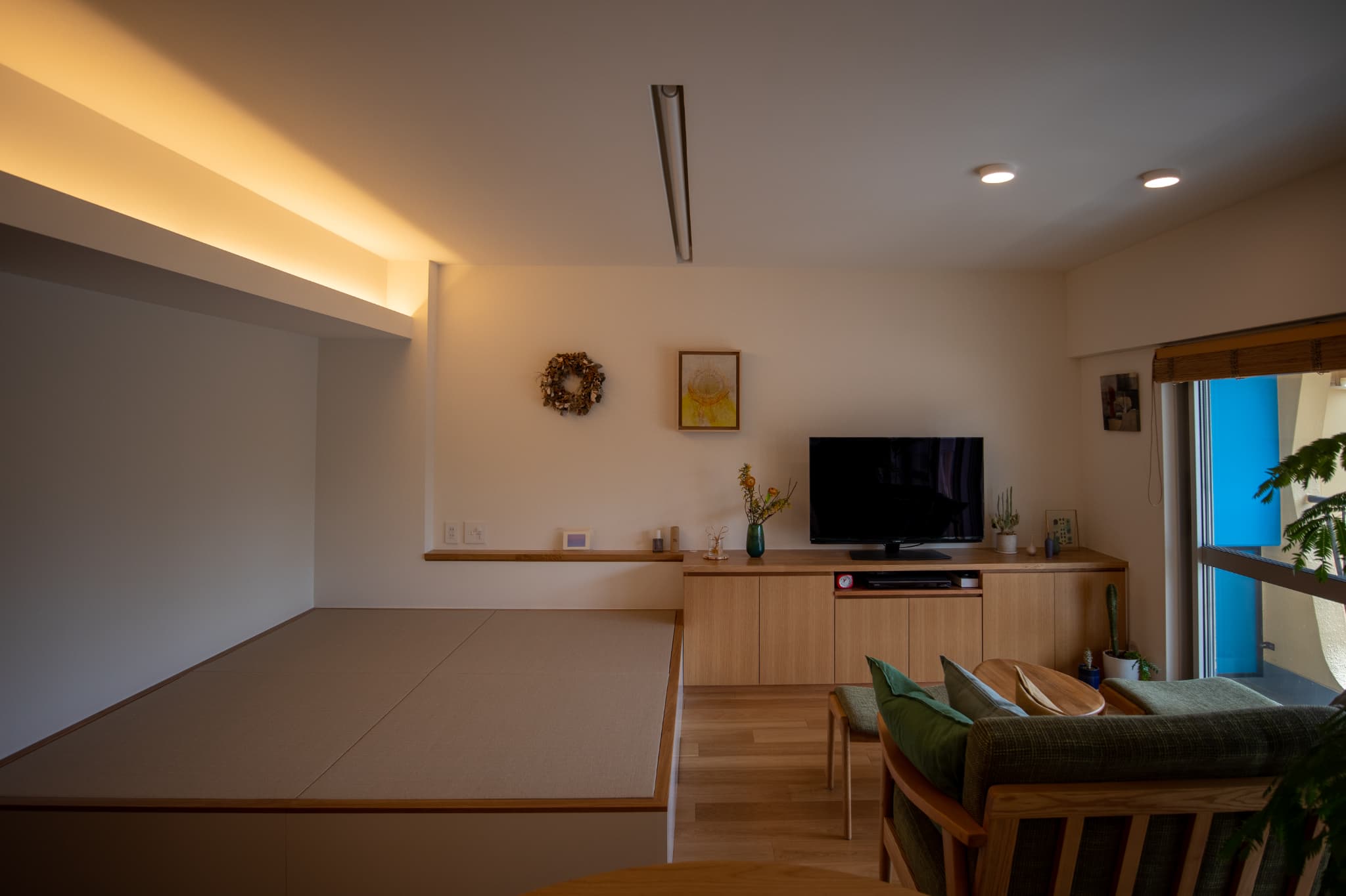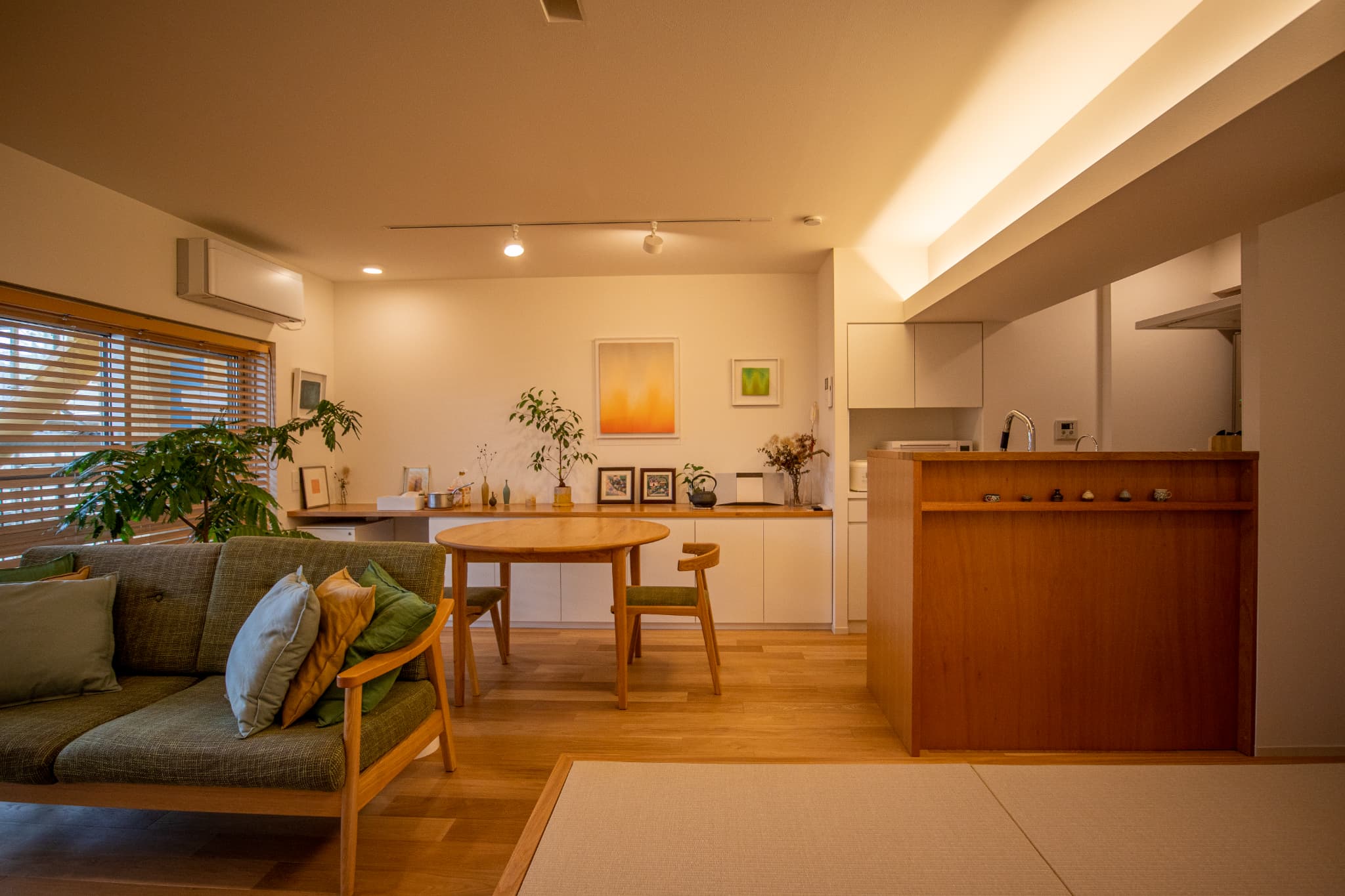 例えば絵や写真を壁にかけられるように白い壁面を多く確保するため、造作の収納を天井までではなくカウンターの高さにし、壁面とカウンターの上に飾る場を設けています。もちろん収納量が犠牲にならないように床下収納を設けるなど、暮らしにくくならない工夫も同時に行っています。写真の『江古田の家』では小上がりの畳スペースの下を収納とすることで収納量を補っています。