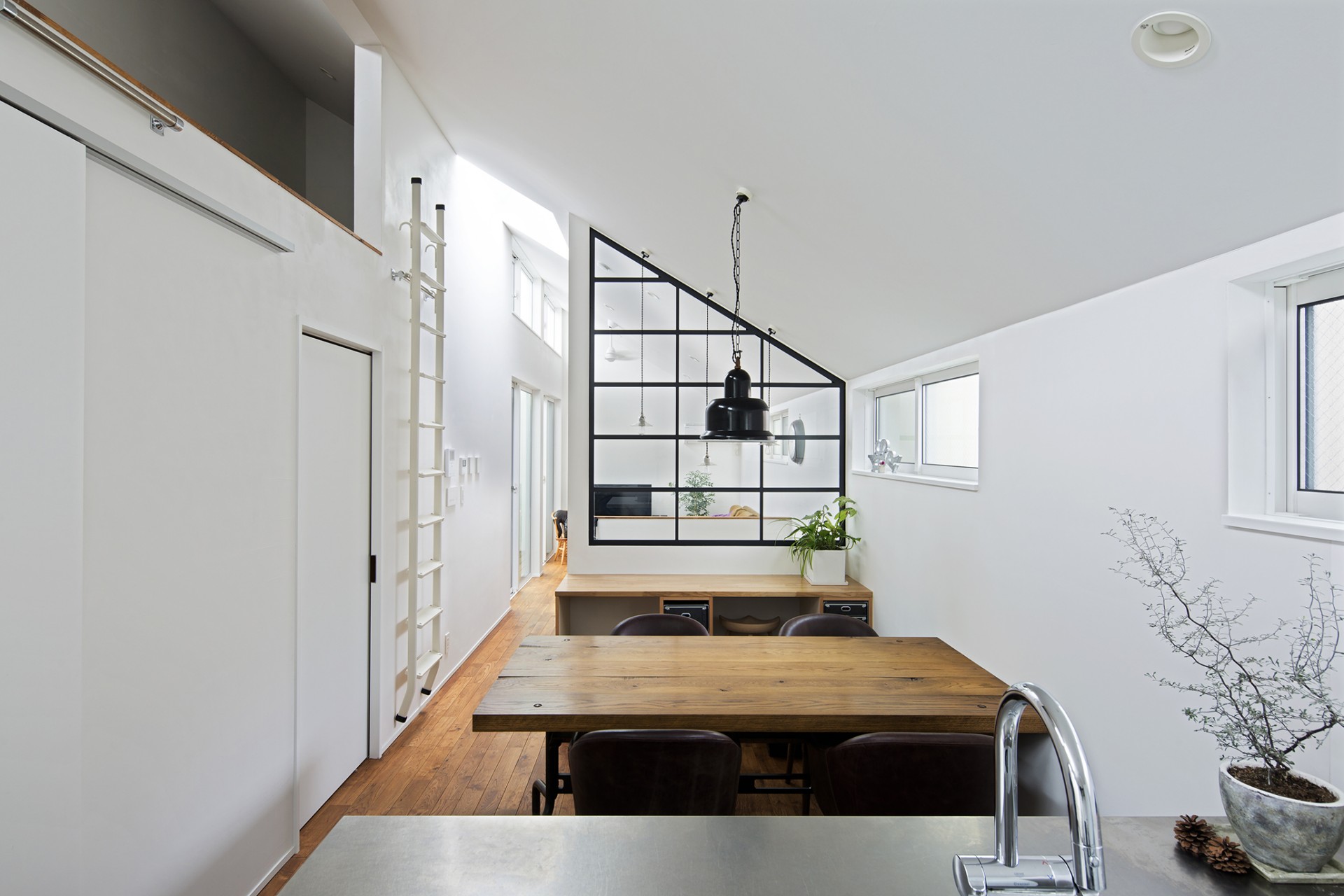 空間全体のつながりを疎外せず、意識的な仕切りにするためガラスの仕切りを設置。ゆるりとつながりながらも、視覚的効果を利用して、集中するスペースと団らんスペースにメリハリを持たせました。
