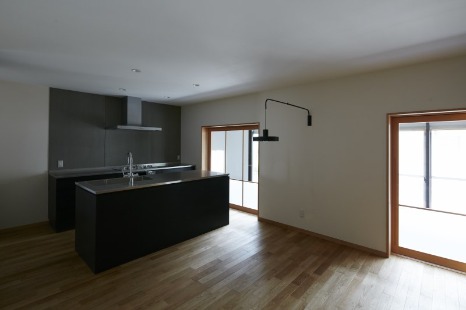 通常レンジフードの壁は防火や防水という機能性が必要なため、タイルやキッチンパネルを採用することが多いですが、この住宅ではフレキシブルボードというセメントを固めたような質感のボードを採用しました。コンクリートの素材、質感の面白さを生かしながら、木製ガラス戸と共にキッチンの雰囲気を引き立てます。