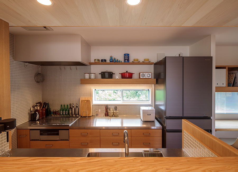 また、キッチンの手前を少し高くし、配膳カウンターを設置しました。完全なオープンキッチンの場合、毎回キッチン上を整理する必要があり、特に共働きや子育て世帯では日常的に難しい場合もあります。配膳カウンターがあることで、自然な目隠しになり、ある程度必要なものはキッチン上に出ていても気にならず、気持ちよく使えます。