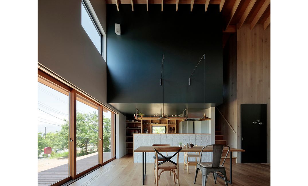 エアコンは特別な設備ではなく、床置きタイプの製品を小上がりの下に収める形で半分は床下、上半分はルーバーで目隠しした状態にしています。天井が高く広々とした空間で、高い位置にエアコンを設置して悪目立ちさせることなく、生活空間を効率よく快適にできるおすすめの工夫です。