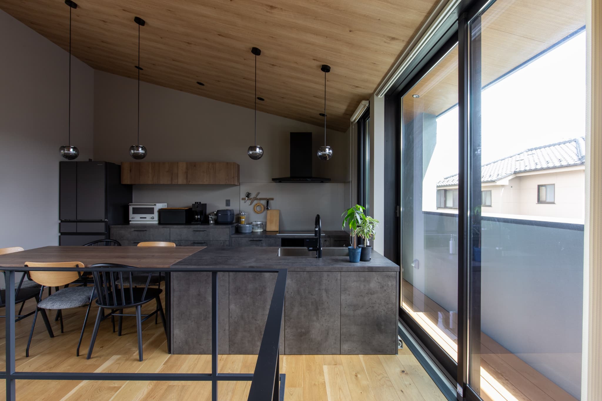 この写真の家では、リビングにうんていとボルダリングウォールを設けました。施主の方は野球一家で、3人のお子さんは全員野球をされています。家でもトレーニングができるような空間が欲しいとの希望がありました。トレーニングルームを別に設けると空間を細かく区切るのでリビングも狭くなり、家族の目も届きにくくなります。そこで、雰囲気を壊さずにリビングをトレーニングもできる空間にすることにしました。ボルダリングというとストーンの部分がカラフルなものが多いですが、ここではグレー1色にして落ち着いた空間になじむようにしました。壁面も当初は周りと同じ色にすることを考えましたが、アクセントとしてその部分は切り替えたいという施主希望で今の色でデザインしました。空間になじんではいますが、ストーンの組み換えもできる本格仕様のボルダリングウォールです。うんていもトーンを合わせ、デザインの一部として存在できるようにしました。