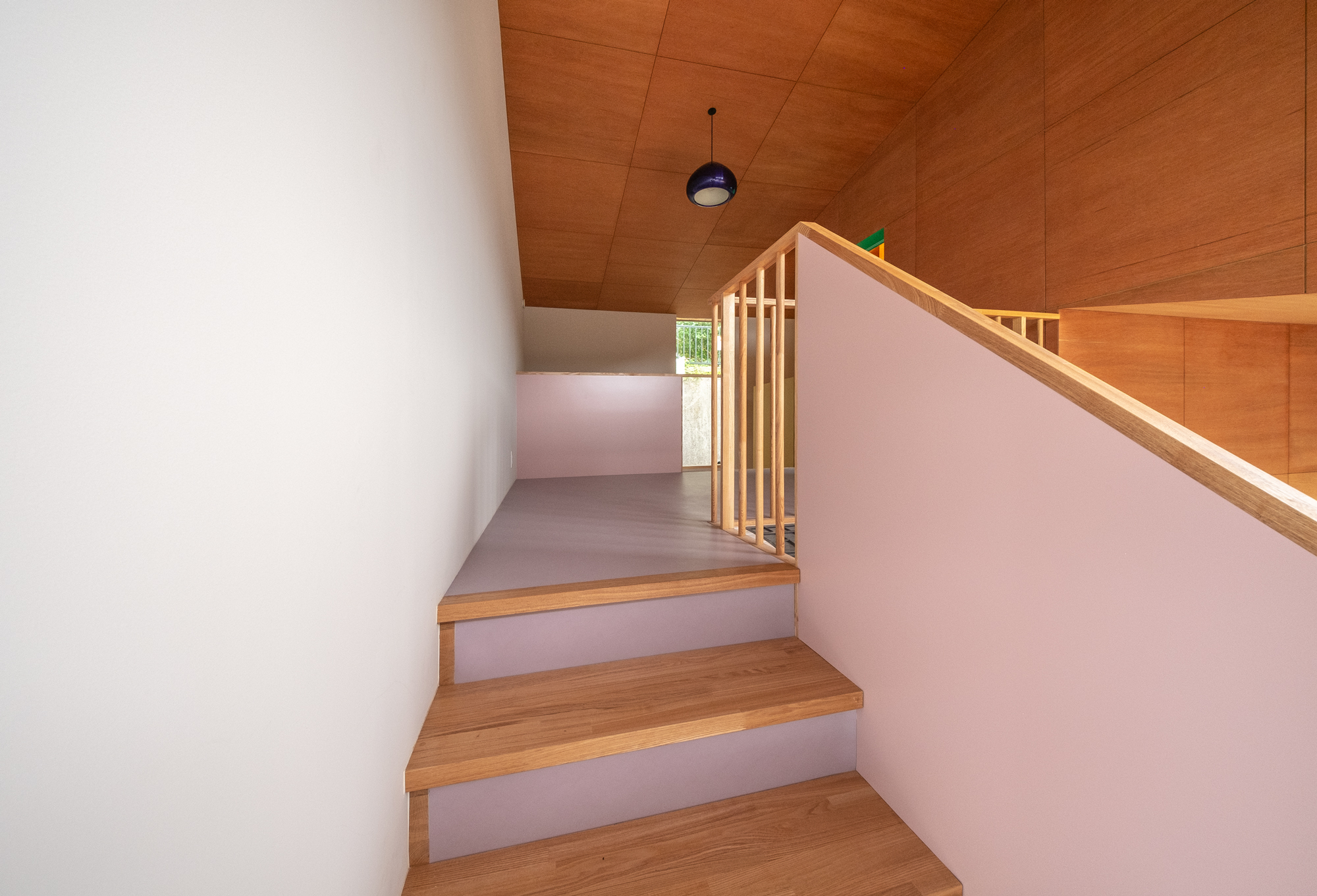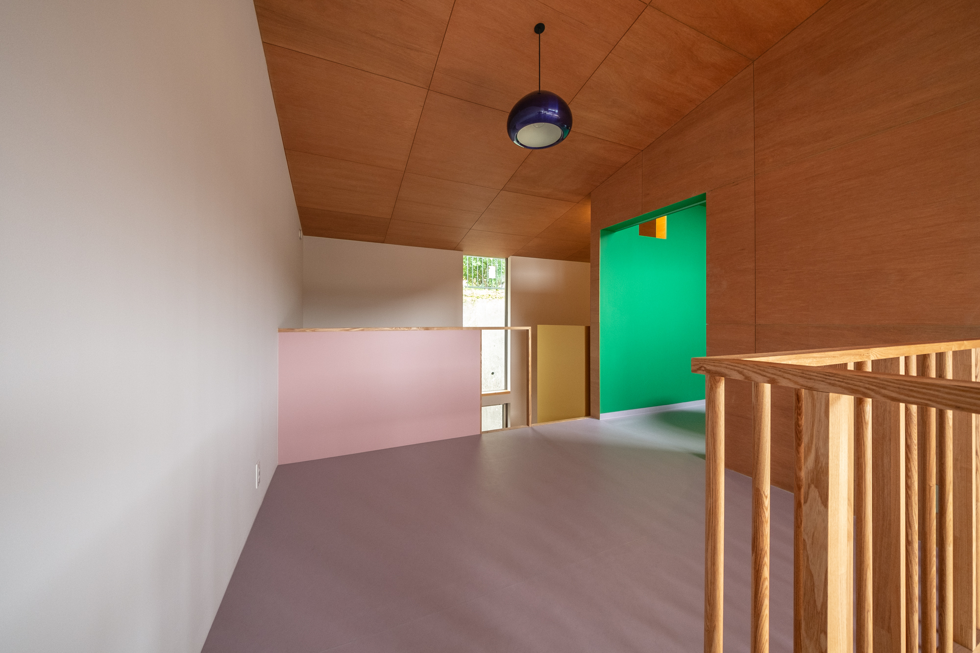 加えて、家族の色の思い出も家に盛りこみました。床に紫色のリノリウムを採用しているのですが、この色には子供との思い出があります。この家に暮らす前、都内の井の頭線沿線に住んでいました。電車が大好きだったまだ小さい息子は井の頭線に夢中で、最初に発した言葉が、なんと車両カラーの「バイオレット」でした。それ以来私たち家族は紫色が思い入れのある色となり、『葉山の住宅』を作る際にも家に紫色を使用することにしました。