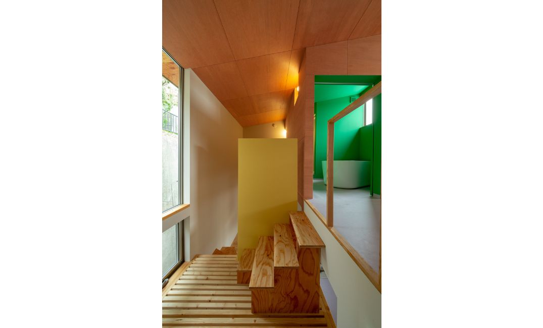 この建物は南側はとても開放的で明るいのですが、北側には擁壁があり、暗くなりがちな立地条件でした。そこで家の奥側である北側を明るく楽しい空間にするため、家の奥に行くほど強く個性的な色を採用しました。光が射すと手前の空間と奥の空間の色が影響しあい混ざって、色が先行して変化して次の部屋と繋がっていくように作っています。トイレや浴室も断絶せず、この家の楽しい色の空間として溶け込んでいます。