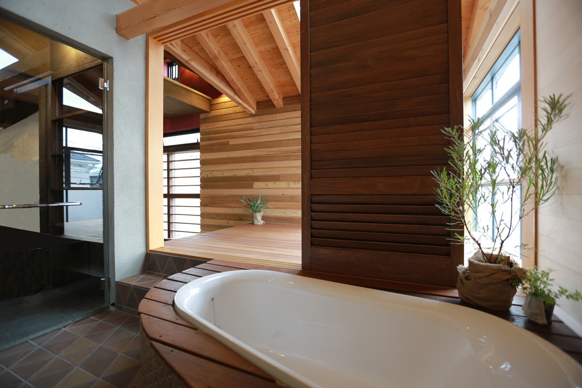 テラスと浴室はスライド式のウッドシャッターで仕切り、使うシチュエーションによって開閉できるように。