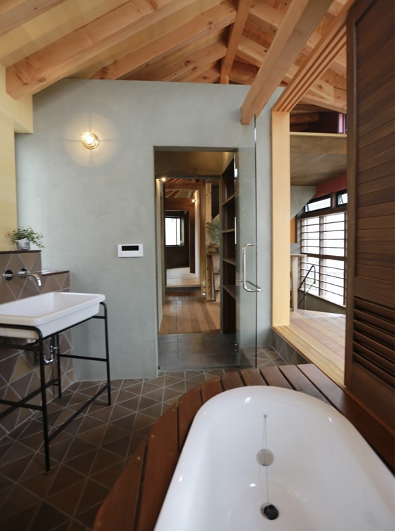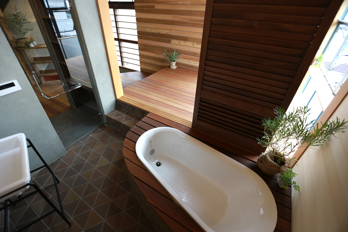 また、浴槽の縁も木を張ることでテラスとの一体感を出し、テラスとして使う時に使い勝手がいいように洗面台をバスルーム内に置きました。