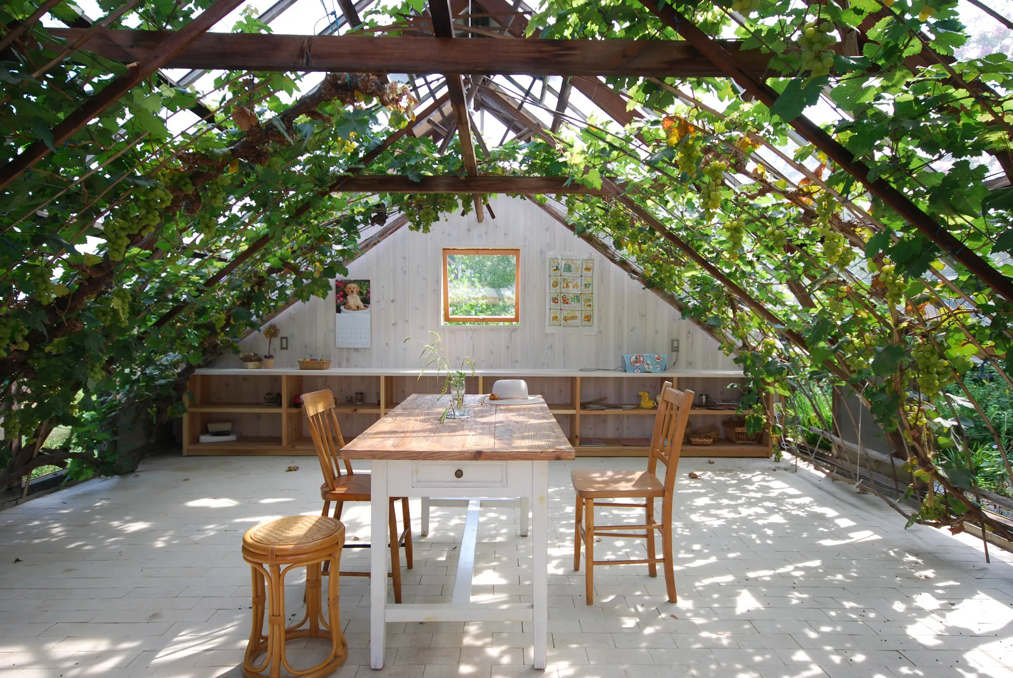 このガーデンハウス内には、無農薬のぶどうが室内に広がり、訪れる人々も贅沢なひとときを楽しんでいます。解体されるはずだった温室は、新しい体験が広がる、ワクワクするような空間へと生まれ変わりました。