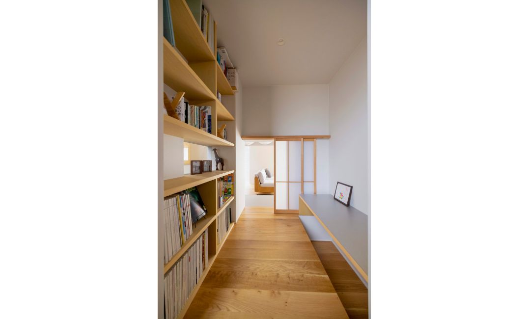 また、その向かいにはお子さん専用の学習スペースを設けました。自分の居場所として落ち着けるように独立はしていますが、両側はロールスクリーンや障子で廊下とリビングにつながっており、孤立はしていません。背面にはキッチン側につながる小窓もあり、お互いの様子を見ることもできます。つながりながらそれぞれの個も大切にする、そんな家族のための家になりました。