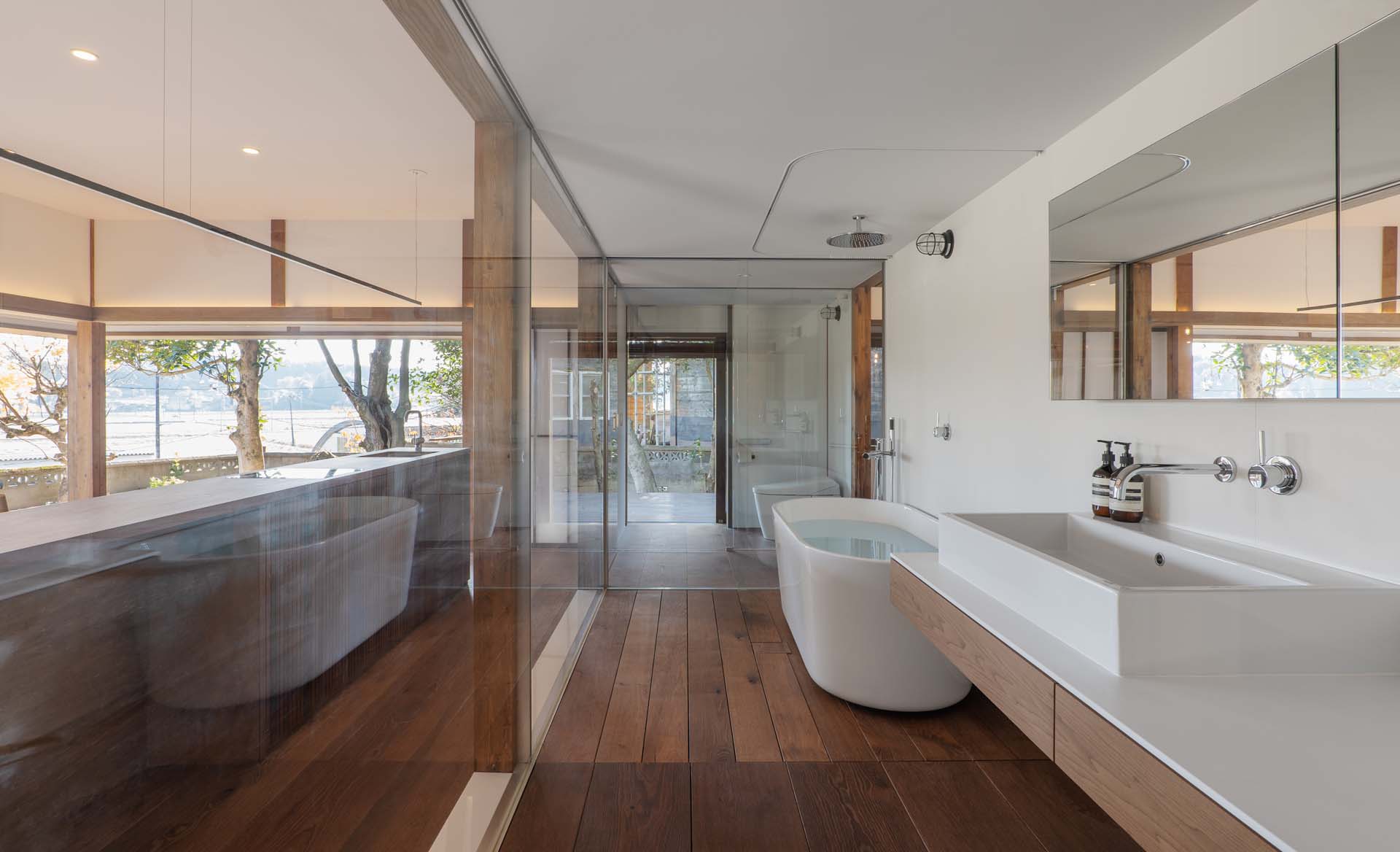 プロの住宅レシピ 光と景色を採りこむガラス張りのバスルーム