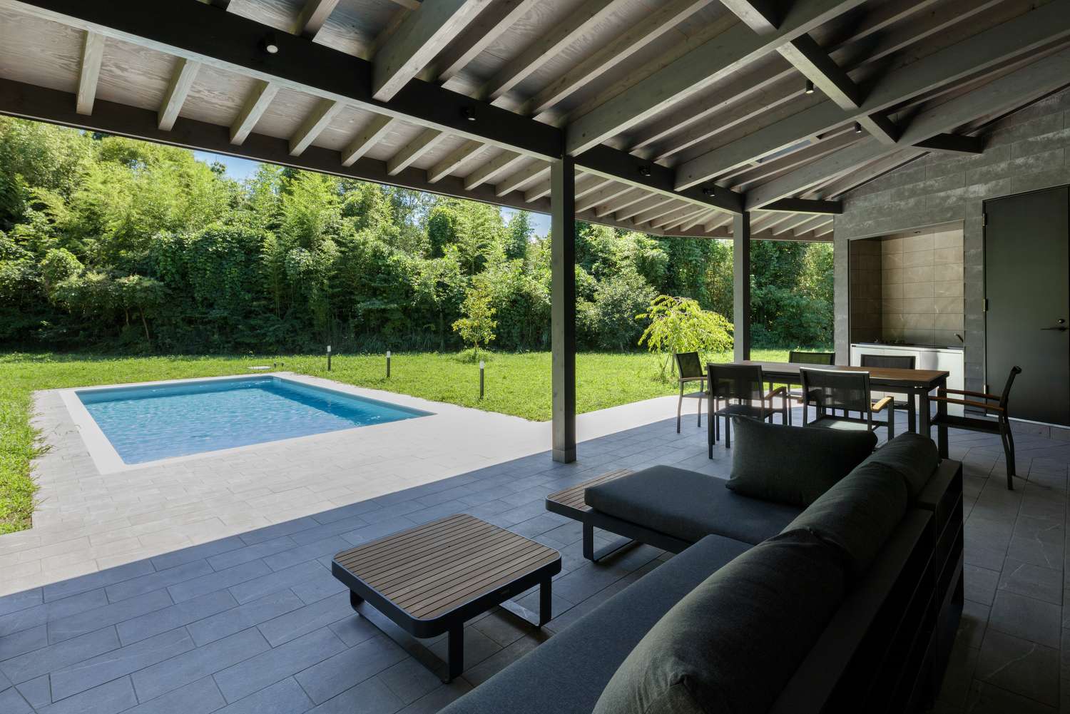 しかし、具体的な過ごし方を伺うにつれ、このご家族にとっては重要な場であり、きっと使いこなせると感じ、50㎡ほどのアウトドアリビングと趣味のダイビングも楽しめるプールを設計しました。