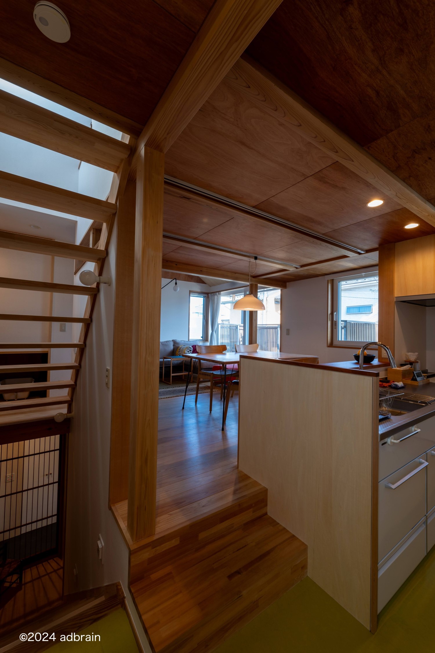 キッチンカウンターの床を30センチ下げることで、ダイニングテーブルとカウンタートップの高さを揃えました。これにより、キッチンで作業する人とダイニングに座る人の視線が自然と合い、会話がしやすくなります。