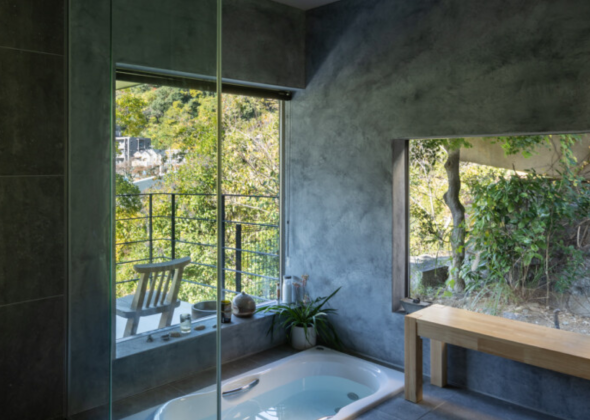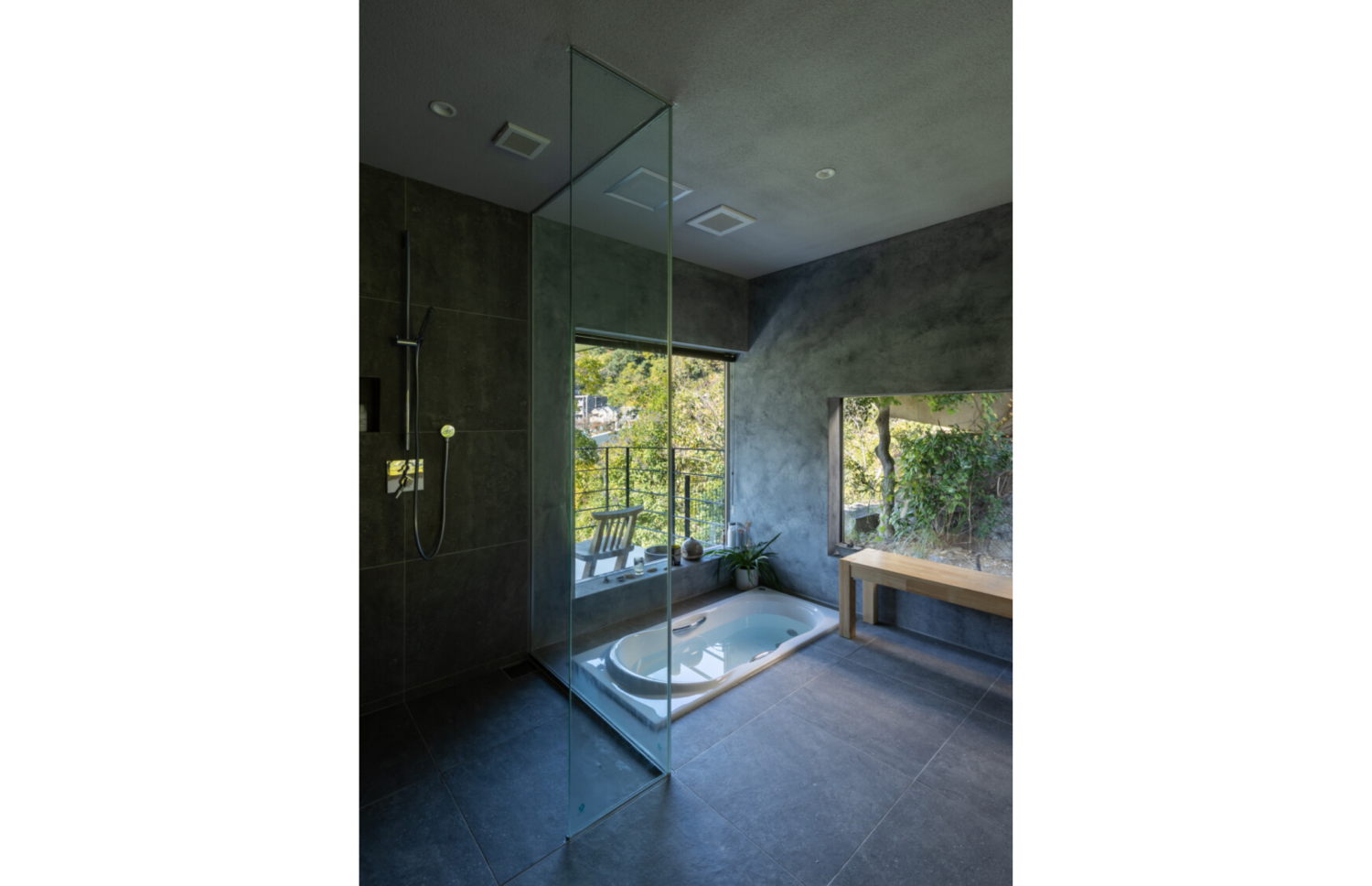 外の庇は深く、3.4メートルほどあるため、通常の設計では浴室の窓からの景色が庇に隠れてしまいます。そこで、お風呂を床面に設け、方形の大きな窓をかなり低い位置に配置することで、広がる景色を存分に楽しめるように設計しました。夜にはテラスからのスポットライトが緑を照らし、昼とはまた違った雰囲気を楽しむことができます。