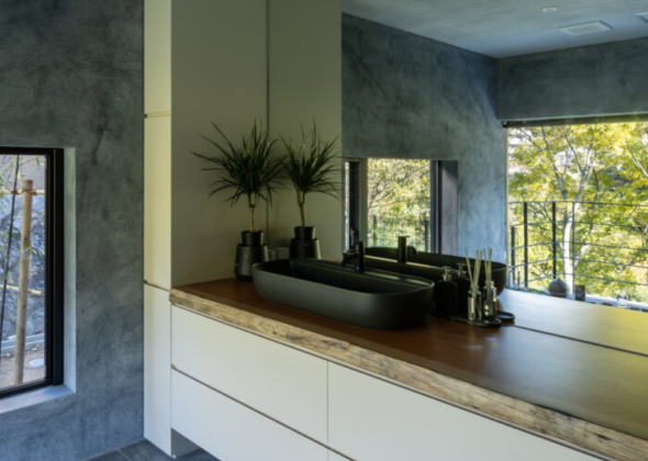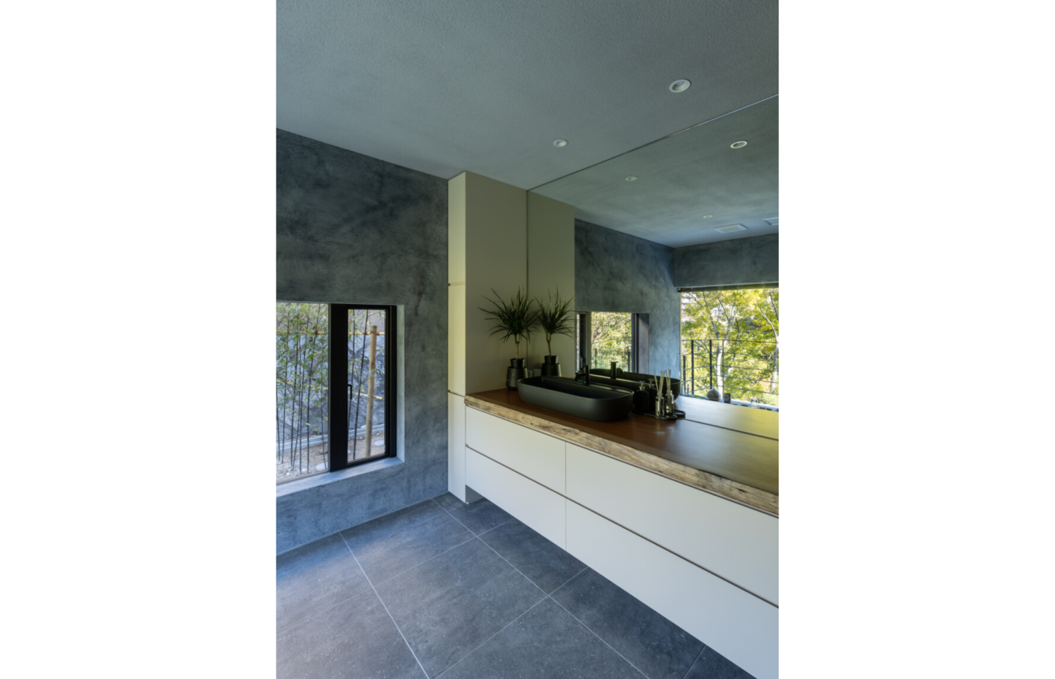 浴室の正面にある洗面所には一面に鏡を設置し、浴室の窓から見える景色がそのまま映り込むように工夫されています。浴室や洗面所の床、壁などは全体的にグレー調に統一されており、取り込む緑の鮮やかさをより一層引き立てています。また、テラスの手すりも極力細く設計し、できる限り景色を妨げないようにしています。