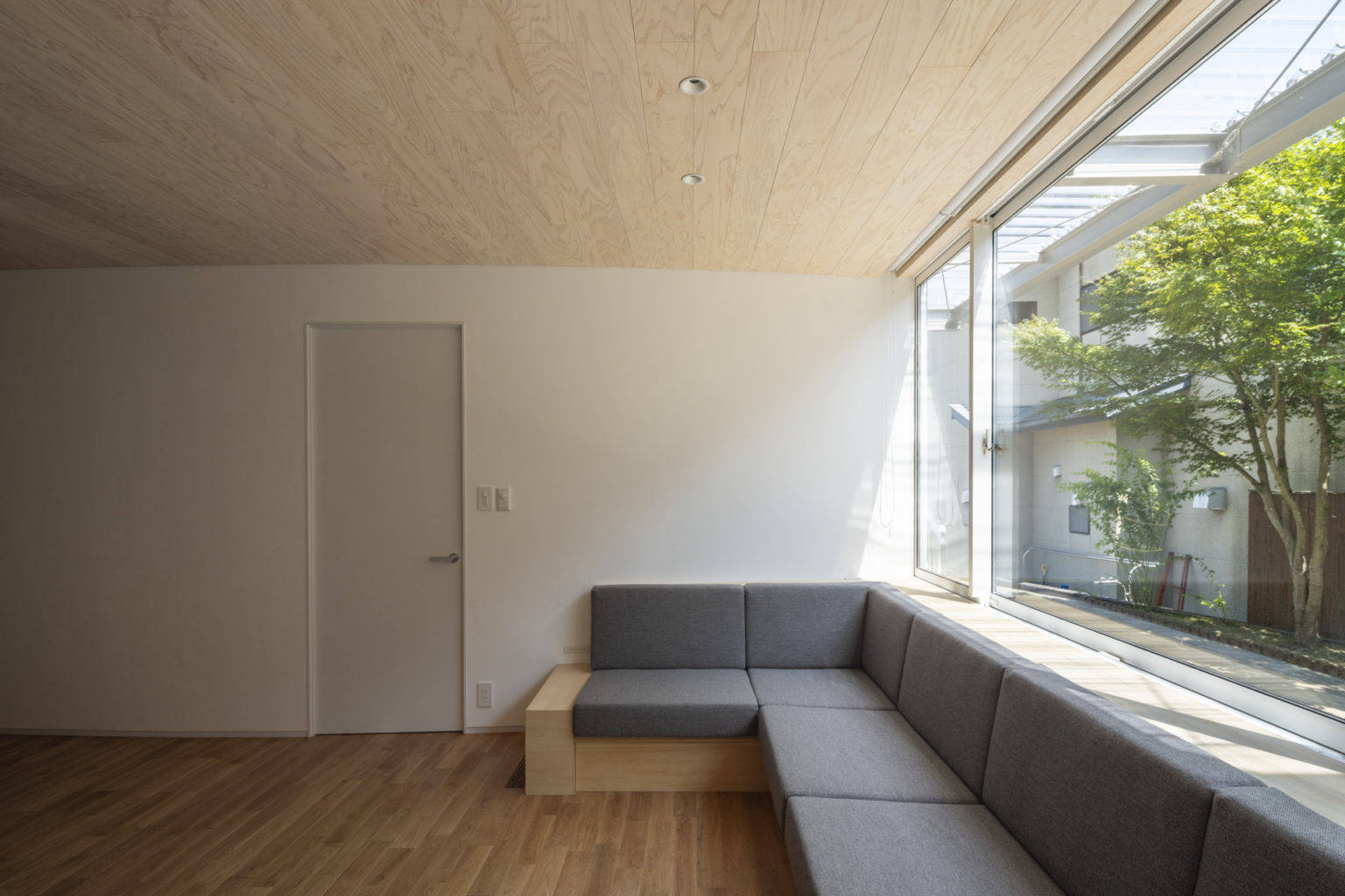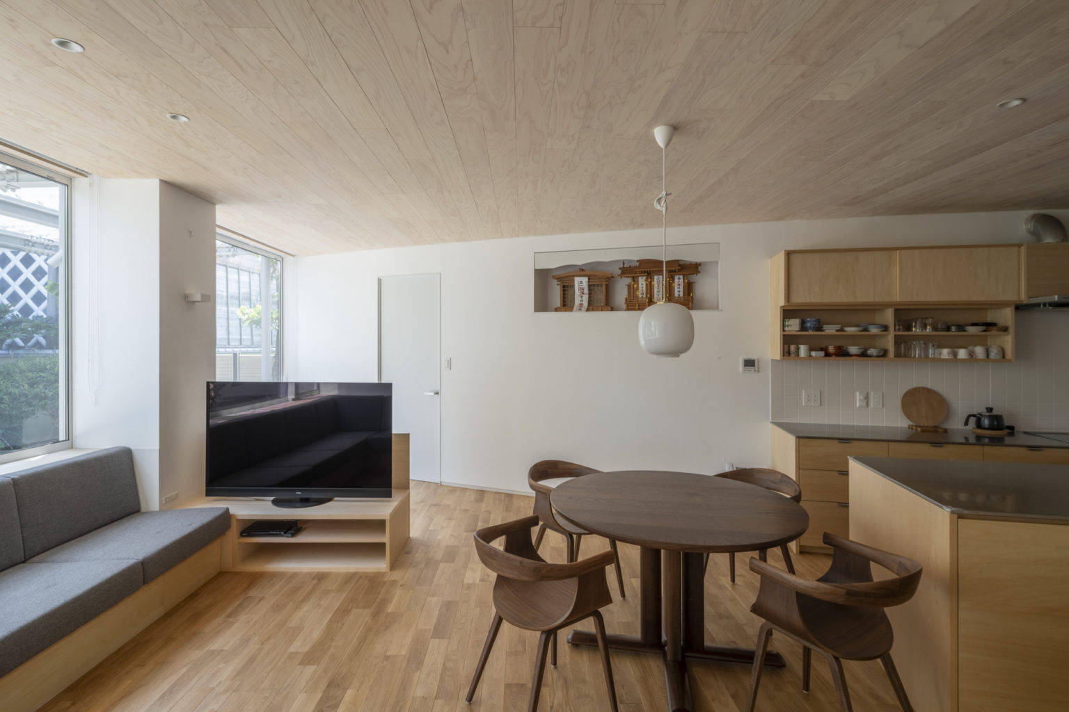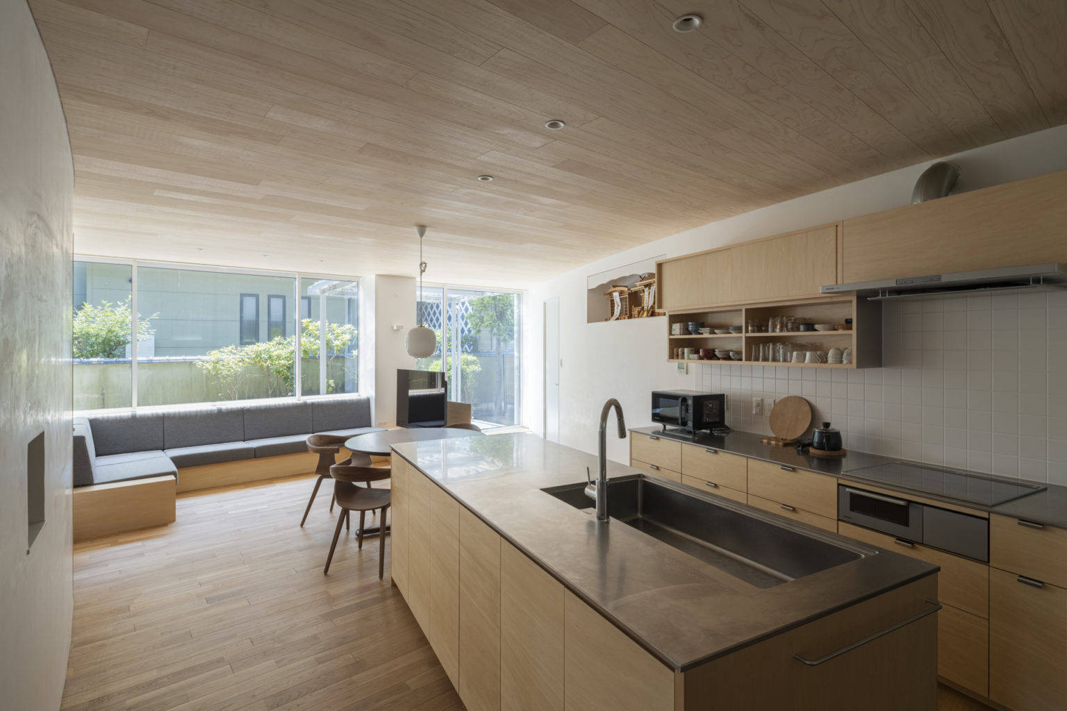 採光については庇を透過性のある屋根材に変更し軒天を撤去すること、南面の開口面積を最大限確保して地面からの反射光も取り込めるようにした。さらに鉄骨造のメリットを活かし、LDKの壁は構造に捉われない曲面の壁を採用した。奥行きの深いLDKの北側まで光を導くためと要求諸室の必要面積を確保するためである。曲面壁は住居内を柔らかく仕切り、他の部屋にいる家族の気配を感じさせる。またLDKに死角ができずお互いに家族の様子が伝わる家族団らんの家となった。