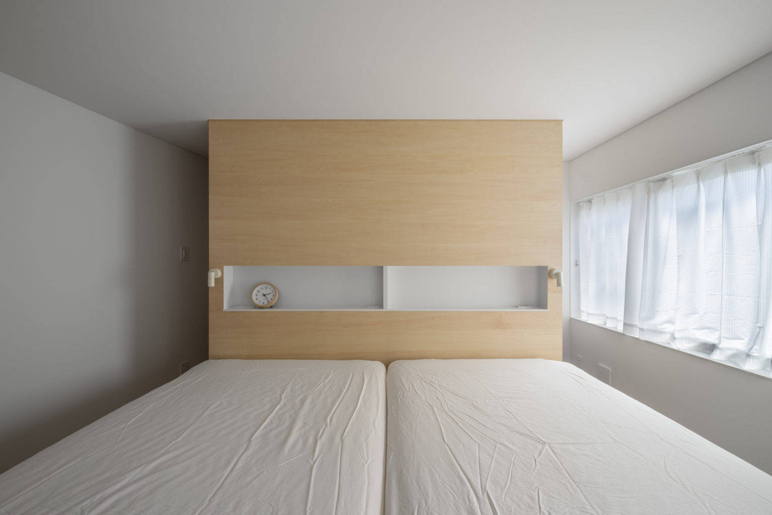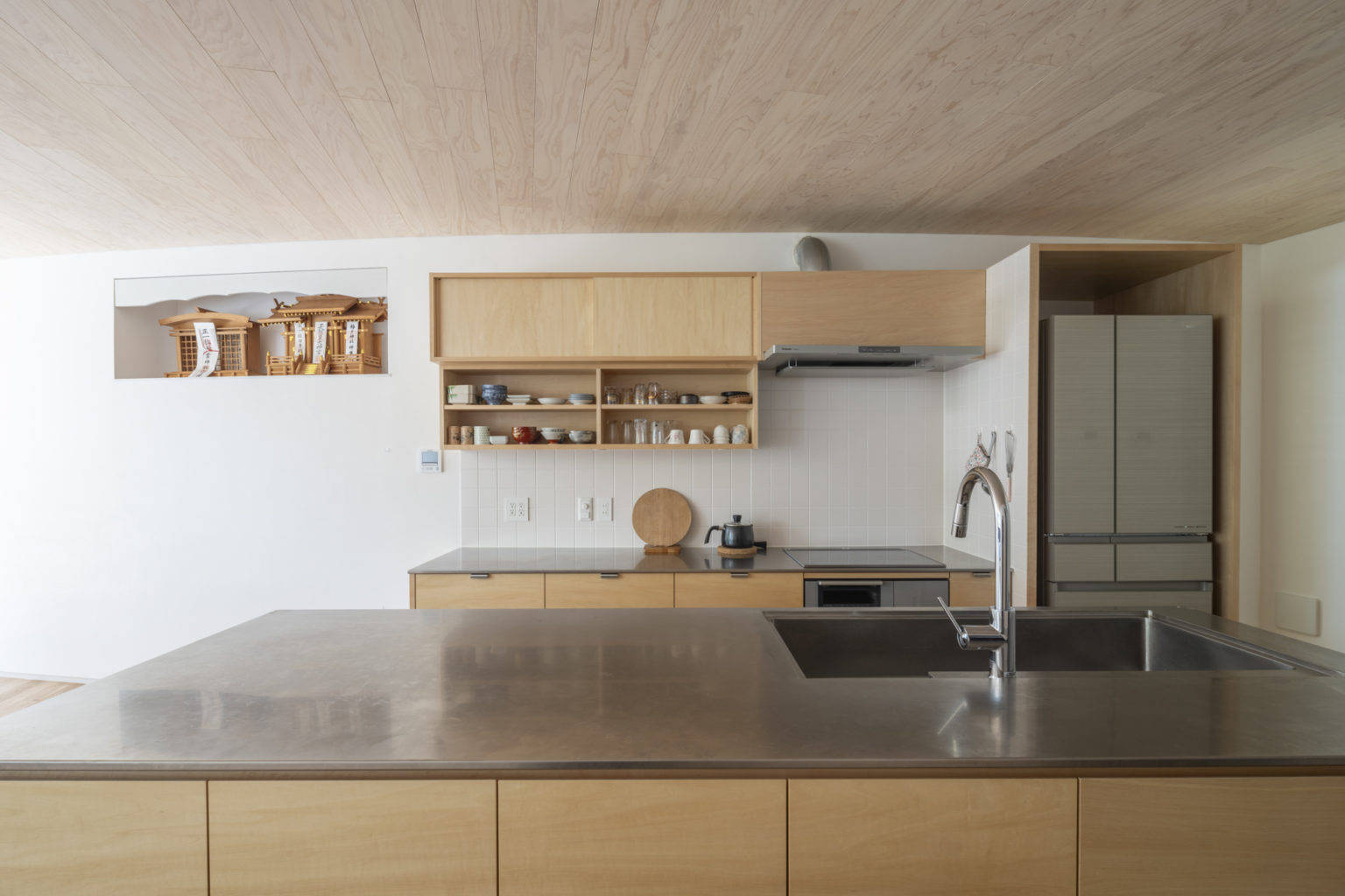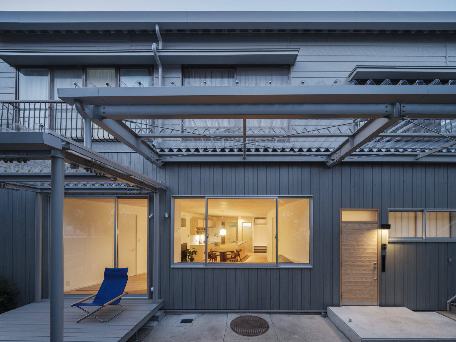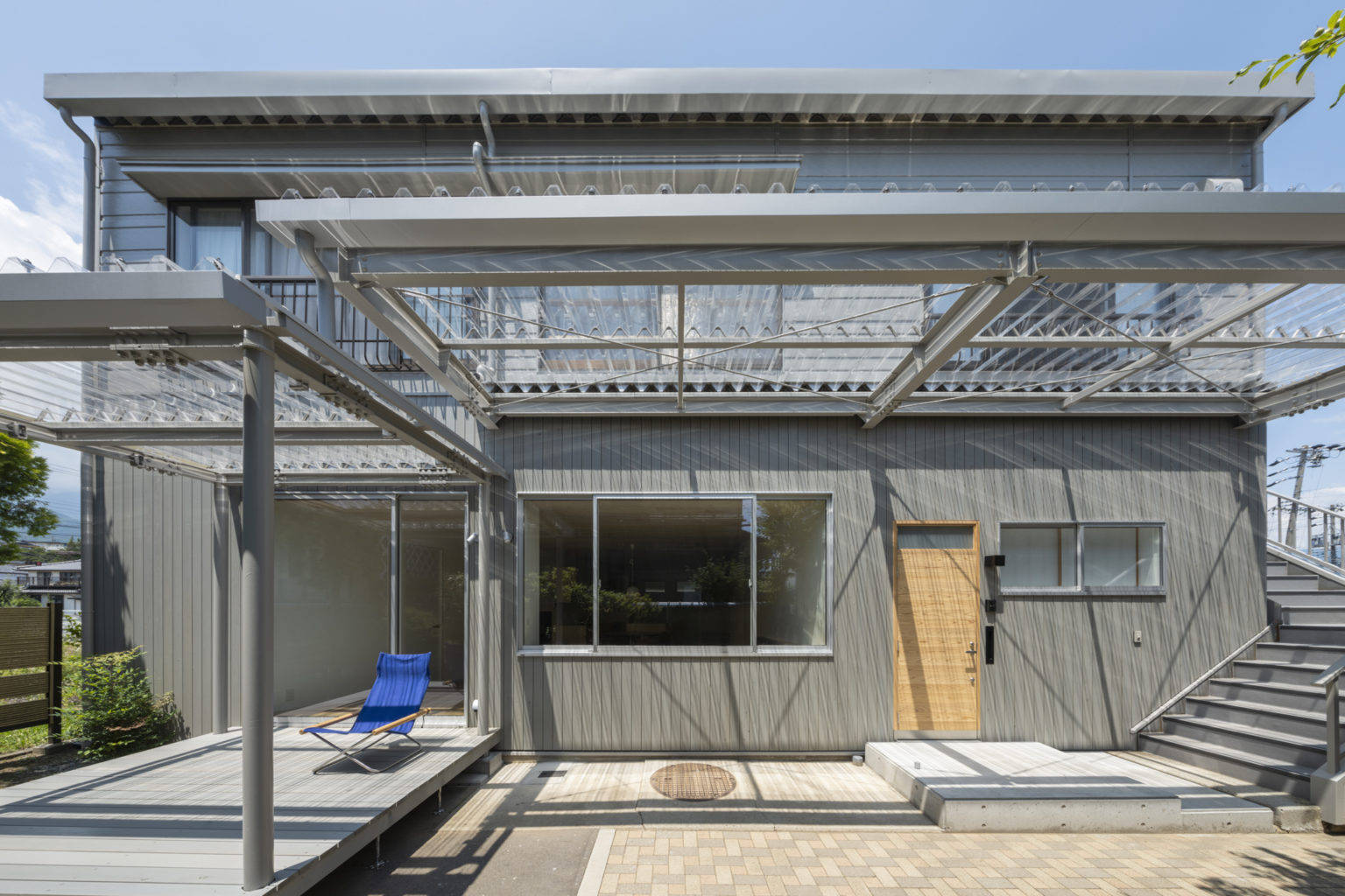採光については庇を透過性のある屋根材に変更し軒天を撤去すること、南面の開口面積を最大限確保して地面からの反射光も取り込めるようにした。さらに鉄骨造のメリットを活かし、LDKの壁は構造に捉われない曲面の壁を採用した。奥行きの深いLDKの北側まで光を導くためと要求諸室の必要面積を確保するためである。曲面壁は住居内を柔らかく仕切り、他の部屋にいる家族の気配を感じさせる。またLDKに死角ができずお互いに家族の様子が伝わる家族団らんの家となった。