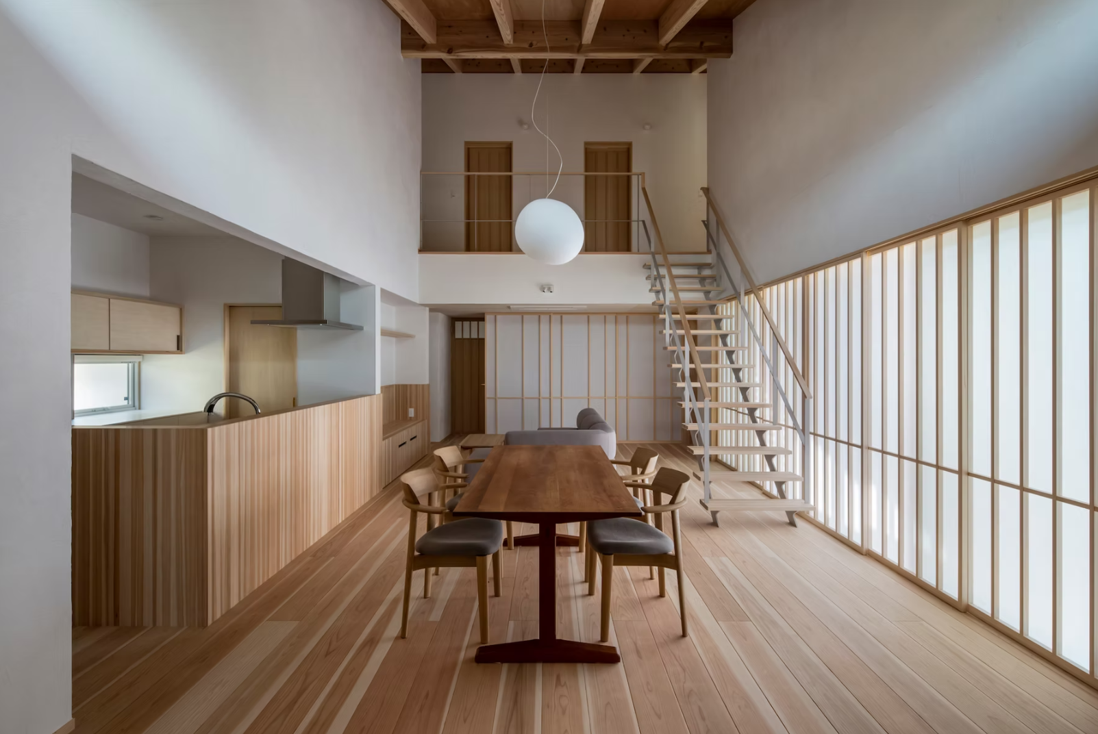 室内は主に無垢材や珪藻土などの自然素材を用いた丁寧な大工の手仕事を基本に、様々なバックグラウンドを持ったエレメントを組み合わせています。建具は日本の伝統的な障子や舞良戸をモチーフとし、採光などの機能に配慮しながら、建物全体としての統一感が感じられるデザイン体系によってデザインされています。