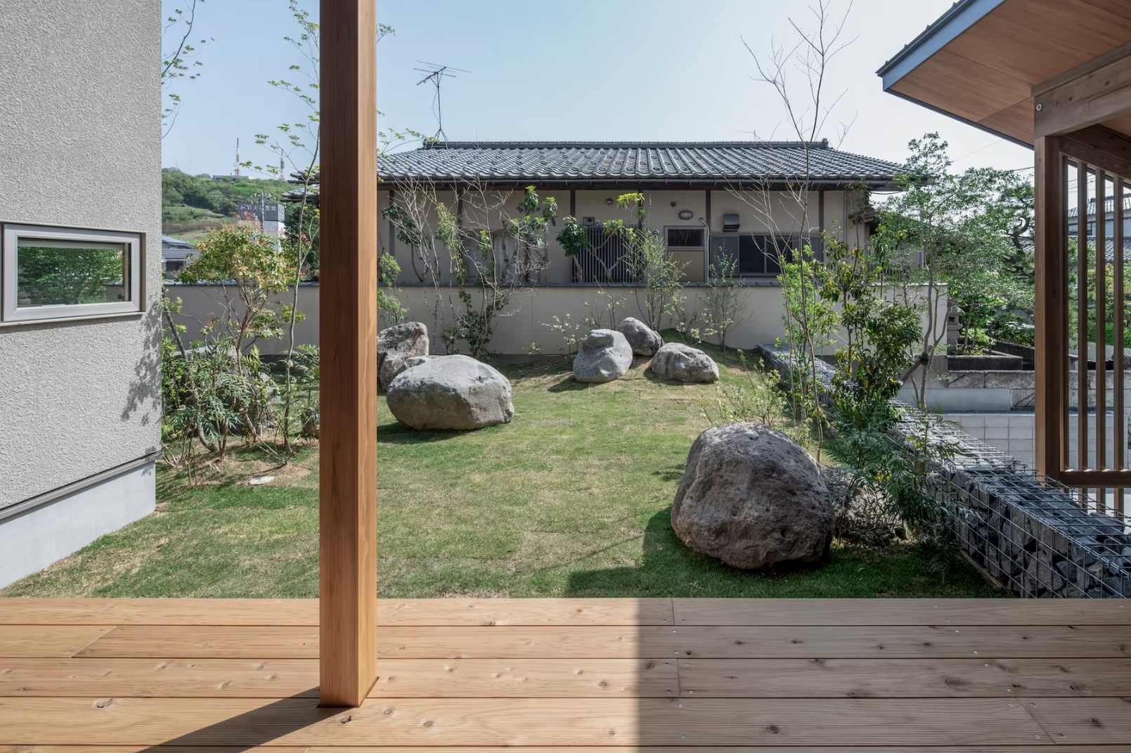 高低差がある敷地に対し、周囲の建物の多くは擁壁によりその高低差を処理し、その上に建物を建てています。擁壁による圧迫感を軽減し、緩やかなまちとのつながりを持つ住宅とするため、その高低差を斜面によって処理し、その斜面に沿って2枚の屋根をかけるような住宅を計画しました。遠景には呉羽山を、近景には周囲の庭園の植栽などを望むことができる立地であったため、プライバシーを確保しながら、それらの借景を日常生活の中に取り込めるような住まいとし、日常的に階段を上下する動線の中で、高揚感や季節感が感じられるよう、窓の位置や形状を工夫しています。