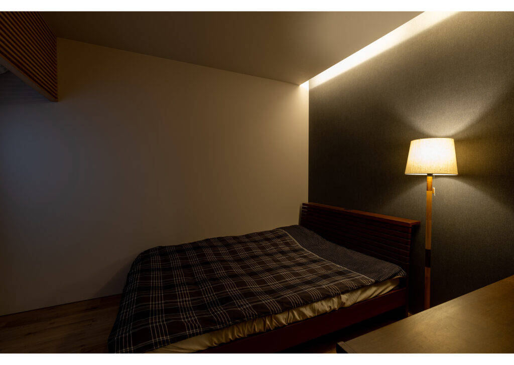 プランは変形地である敷地形状をそのままオフセットさせ、敷地奥から前面道路側に向けて徐々に広くなっています。この斜めに広がる壁は部屋を広く見せる効果もありますし、音楽スタジオの音響にも良い影響を与えています。クライアントご夫婦の共通の趣味である音楽演奏を存分に楽しみながら、開放的で伸びやかな家族の空間を両立させた住宅です。
