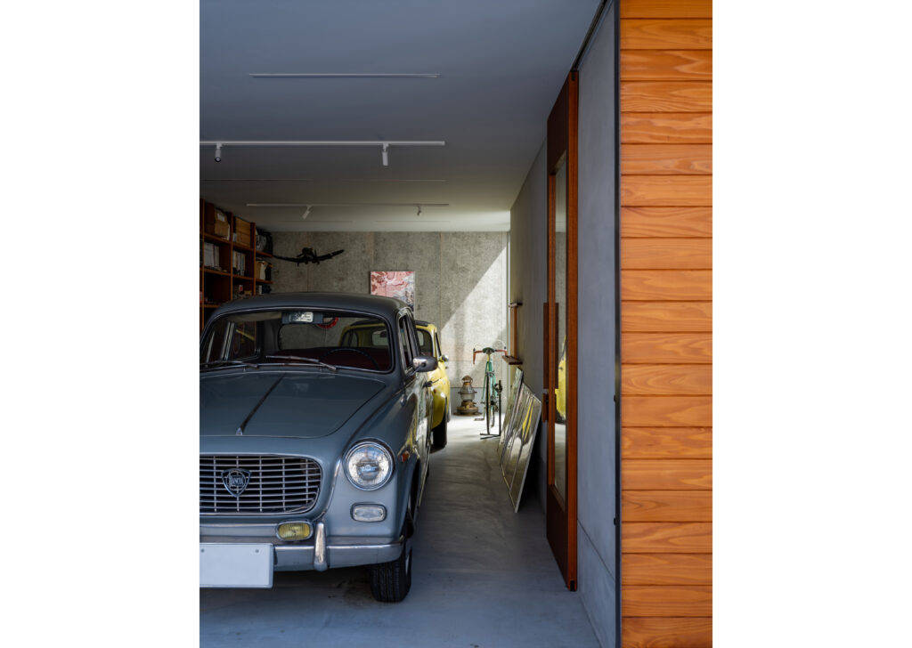 愛車フィアット・チェントをはじめ、2台の車と複数のバイクを収容できるガレージには、木毛セメント板やモルタル仕上げの壁を採用。