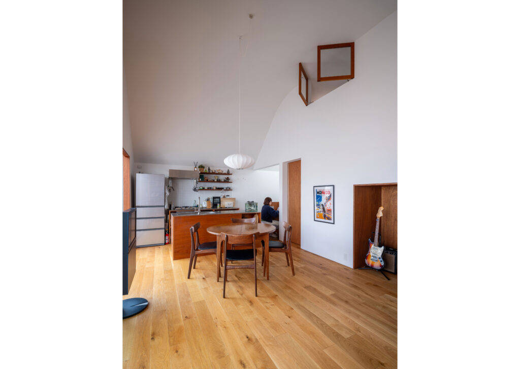 LDKは曲線天井により光をやさしく拡散し、空間に奥行きと落ち着きをもたらします。白を基調にした内装と落ち着いたトーンの床仕上げにより、ヴィンテージの家具や雑貨が自然と調和する背景を整えました。
