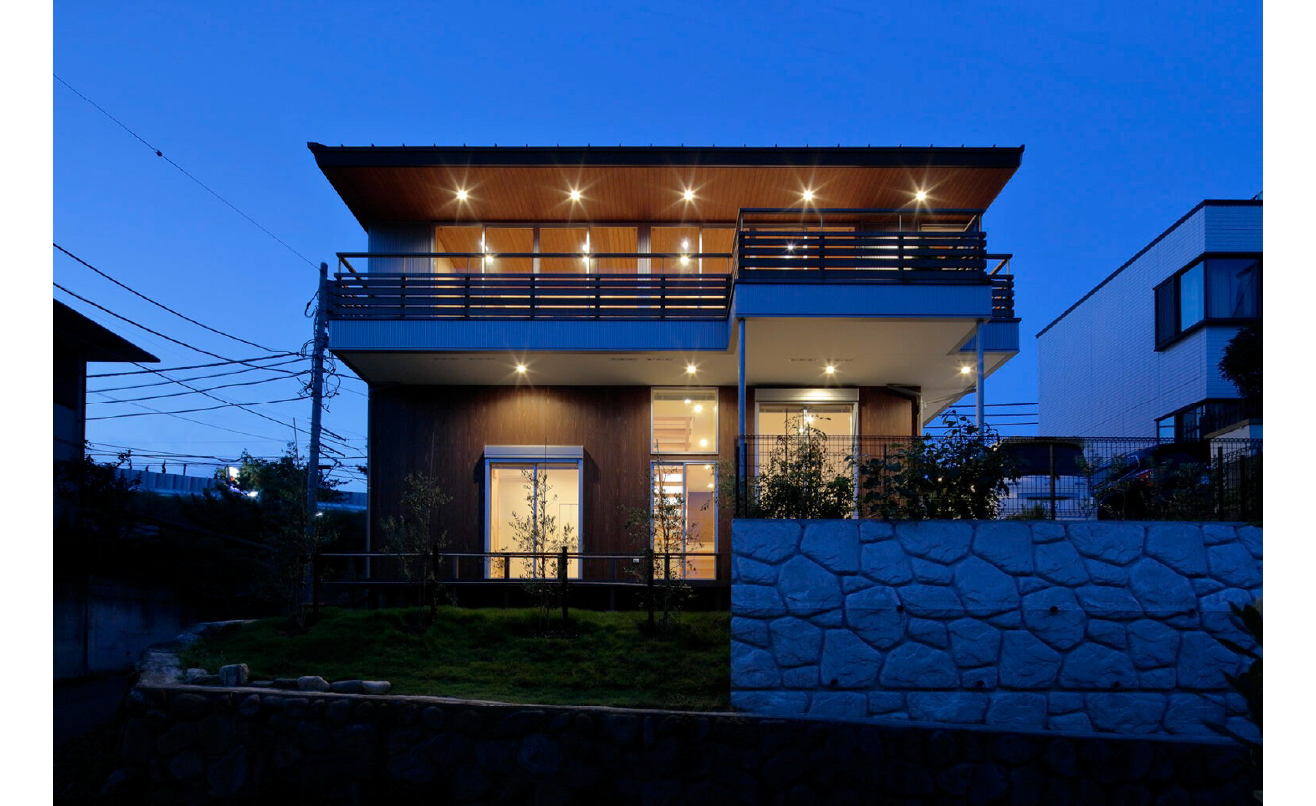 もともと2段擁壁のあった、海を望める敷地です。2段擁壁を解体し、一部は構造上安全な擁壁を構築し、その他の部分は、もともとあった斜面を復元しました。そこへ海への眺めを最大限確保できるように2階にリビングを計画しました。1階から2階へのスケルトン階段の隙間からも海が垣間見れ、2階に上がると一気に展望が開けます。海を望む窓は、あえて高さを抑え、より水平方向への拡がりを感じられるような仕掛けとなっています。さらにホワイトアッシュフローリングと珪藻土壁、杉板張りが空間に温もりを与えています。