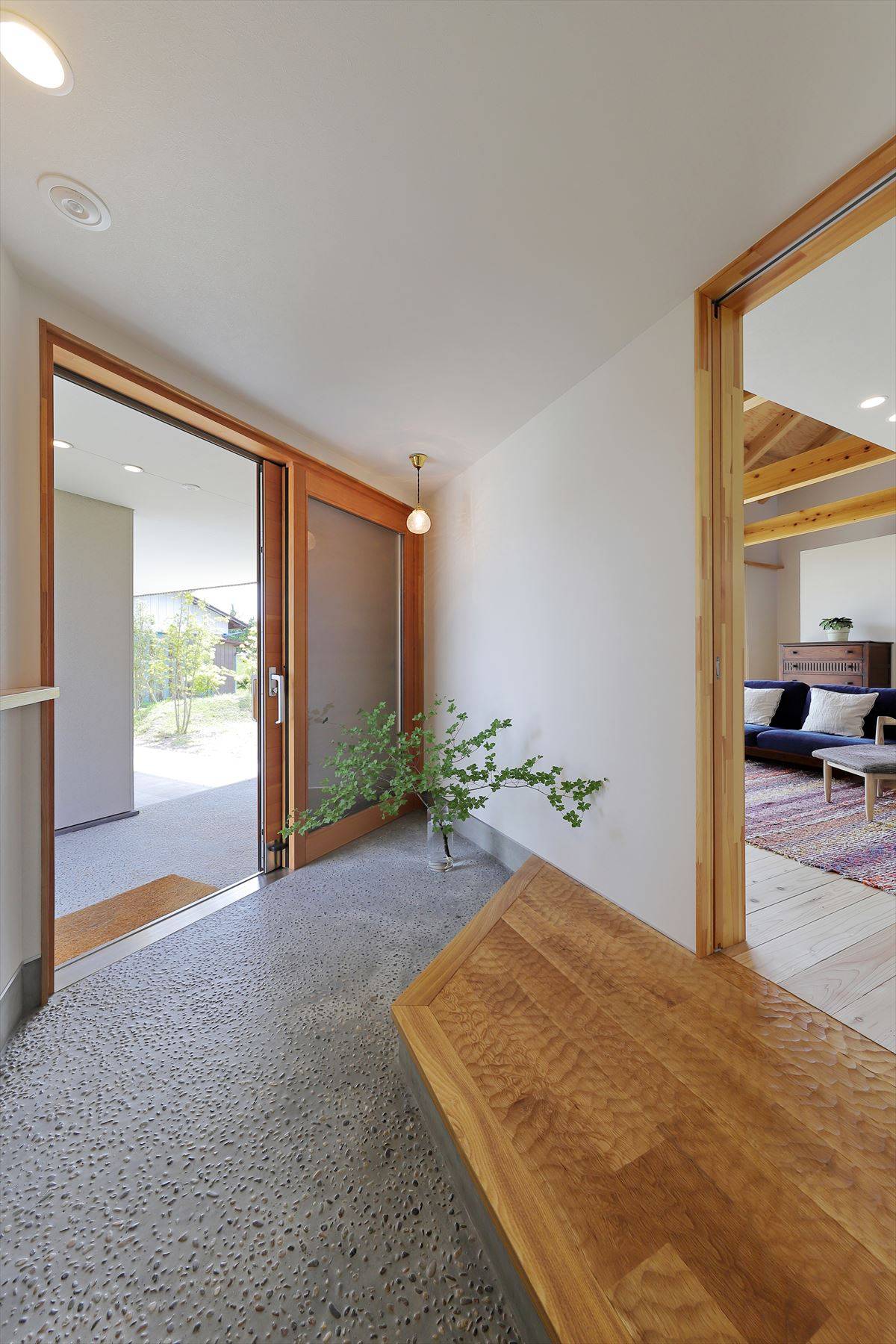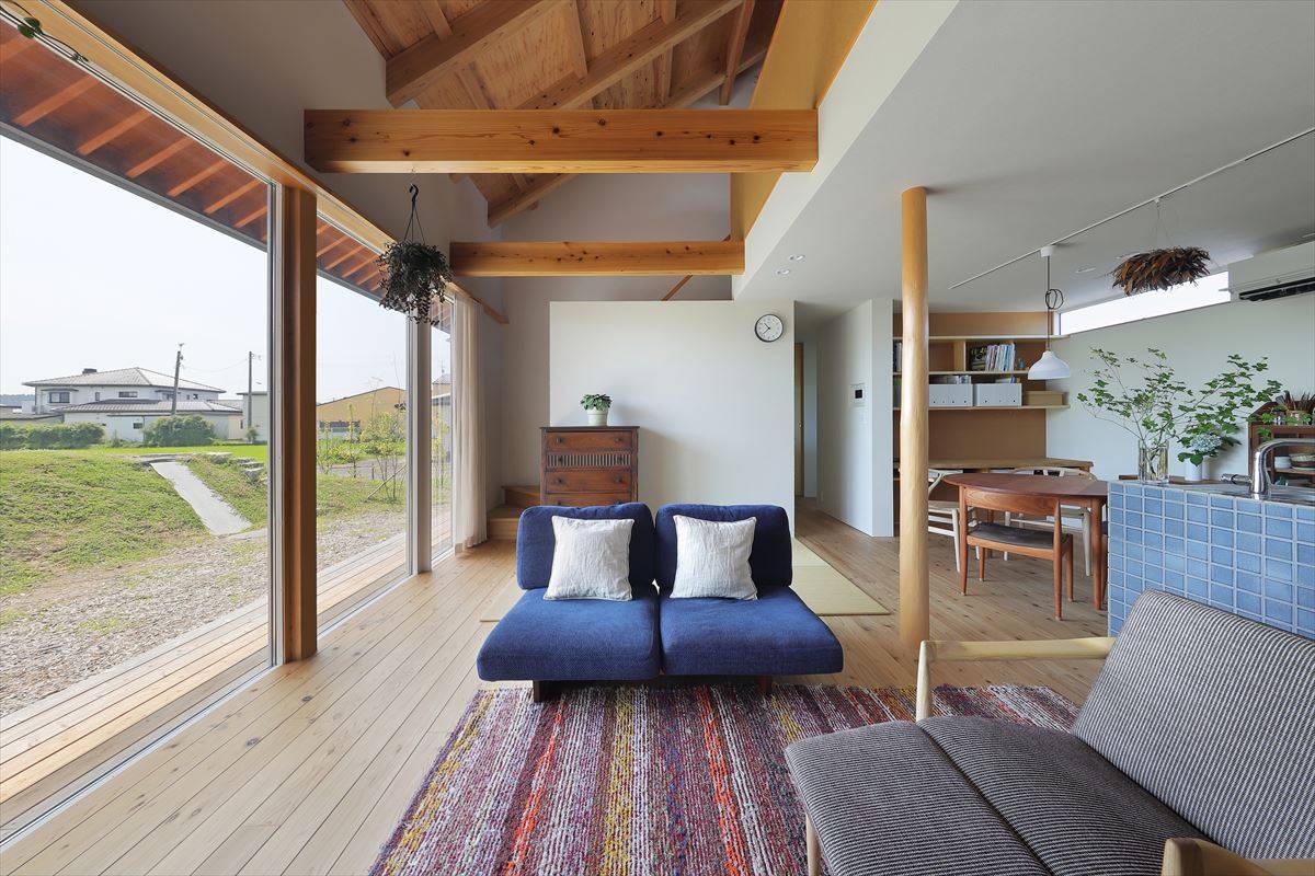 勾配屋根のリビングに内と外をつなぐ縁側の役割をしてくれる...