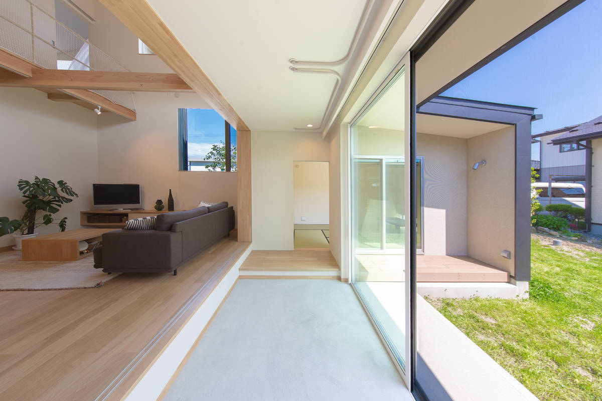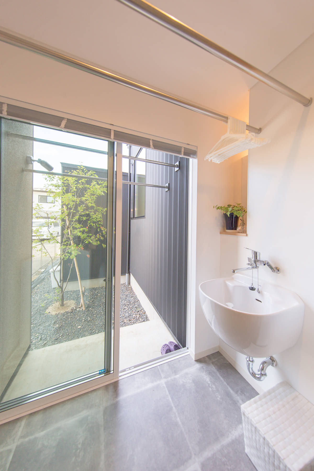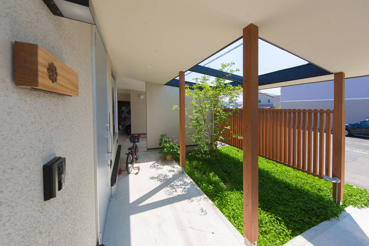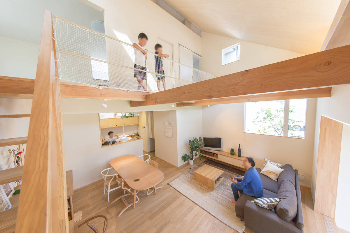 外部からの視線を適度にさえぎりつつ明るく開放的な室内外を求めて、大きく3つの庭を取りながら建物配置を決めて行きました。一つ目は玄関ポーチ前の迎えの庭、土間の前に大きく広がるクローバーの庭、最後に脱衣からの物干しスペースを兼ねリビングに明かりと風を届ける光庭。3つの個性ある庭が来る人や家族の暮らしを彩ります。クローバーの庭と室内との中間領域として大きな土間空間を配置し、外のつながりとして室内の延長として機能するあいまいな場所を用意しました。大きな本棚や物干しなども備え、暮らしの機能を果たしながらリビングとの段差に腰掛けて本を読んだり、友達と話したりする縁側のような場所になることも期待しています。また、室内は家族玄関から続く裏動線の先にキッチンや洗面・浴室などの水周りへとつながり、家事動線をコンパクトにまとめています。リビングの大きな吹き抜けの先の2階には個室が並びます。また、家族それぞれのカウンターが書斎やママコーナー、階段下のスタディーコーナーに用意されています。家族みんなが集まるリビングを中心にそれぞれの居場所がちりばめられた家となりました。