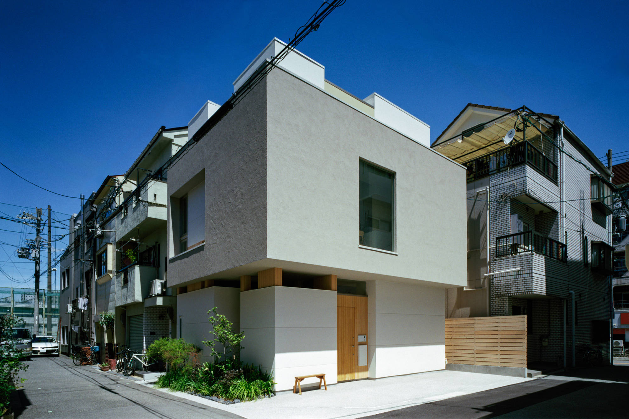 建物の高さを最大限に活かすため、道路斜線制限に対しては天空率を検討し、都市のスカイラインに貢献するようなデザインを目指しました。また、2階のボリュームは軒下から天井まで壁と同じ仕上げにすることで、まるで空中に浮いているかのような軽快な印象を与え、見る人に驚きを与える面白い外観を実現しています。