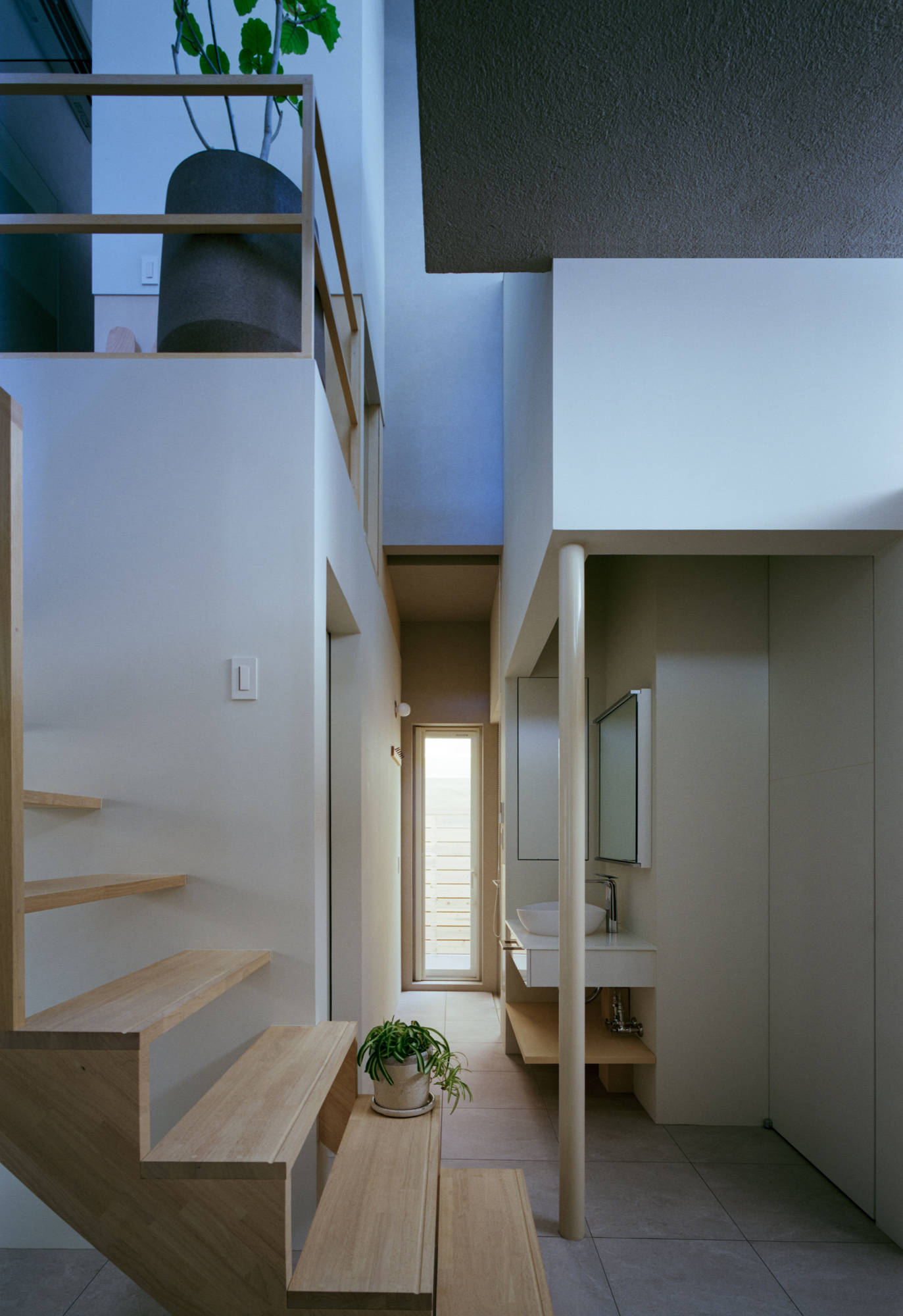 今回のデザインでは、4つのボリュームが2階まで伸びる吹き抜けを設けることで、開放感と奥行きのある空間を創出しました。それぞれのボリュームは適切な距離を保ちつつ配置されており、脱衣スペースなどの機能を持つ「路地」のような隙間が生まれます。これにより、横方向への視線の抜けも意識し、心地よい広がりを感じられるようにしました。